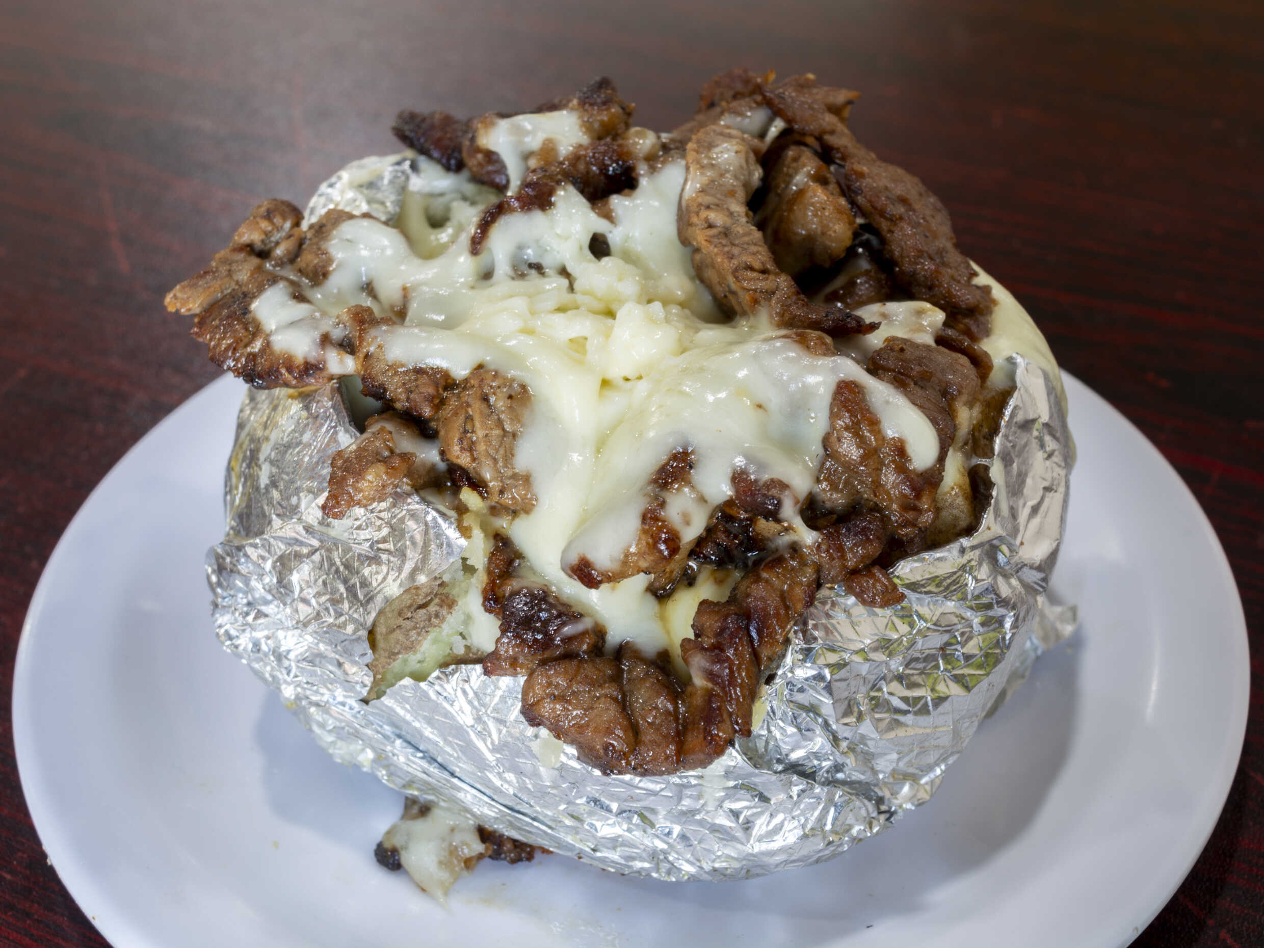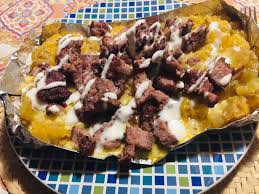 Papa asada acompañada de fajitas de sirloin, tocino frito, queso y mantequilla.