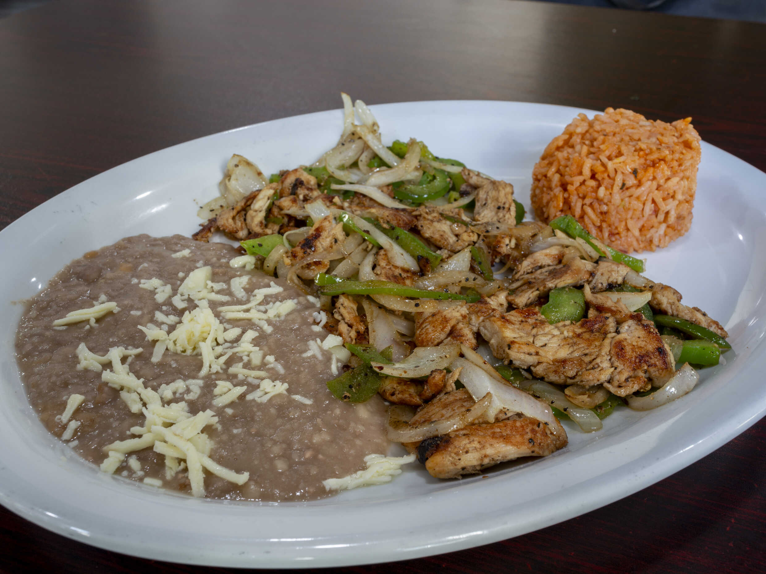 Fajitas de pollo y sirloin marinadas en salsa de la casa, acompañadas con salteado de pimiento morrón y cebolla.