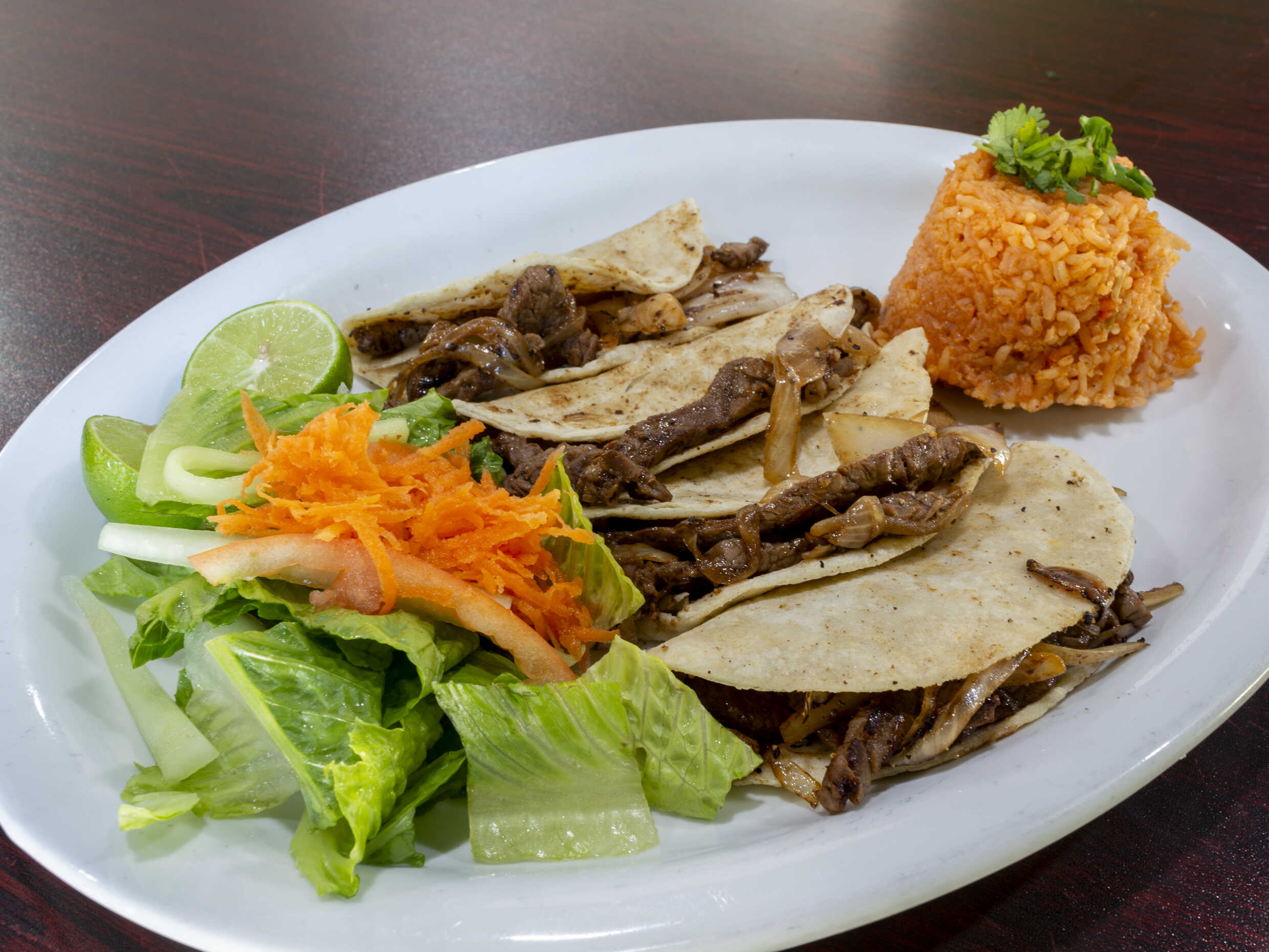 Con arroz, frijoles o ensalada.
