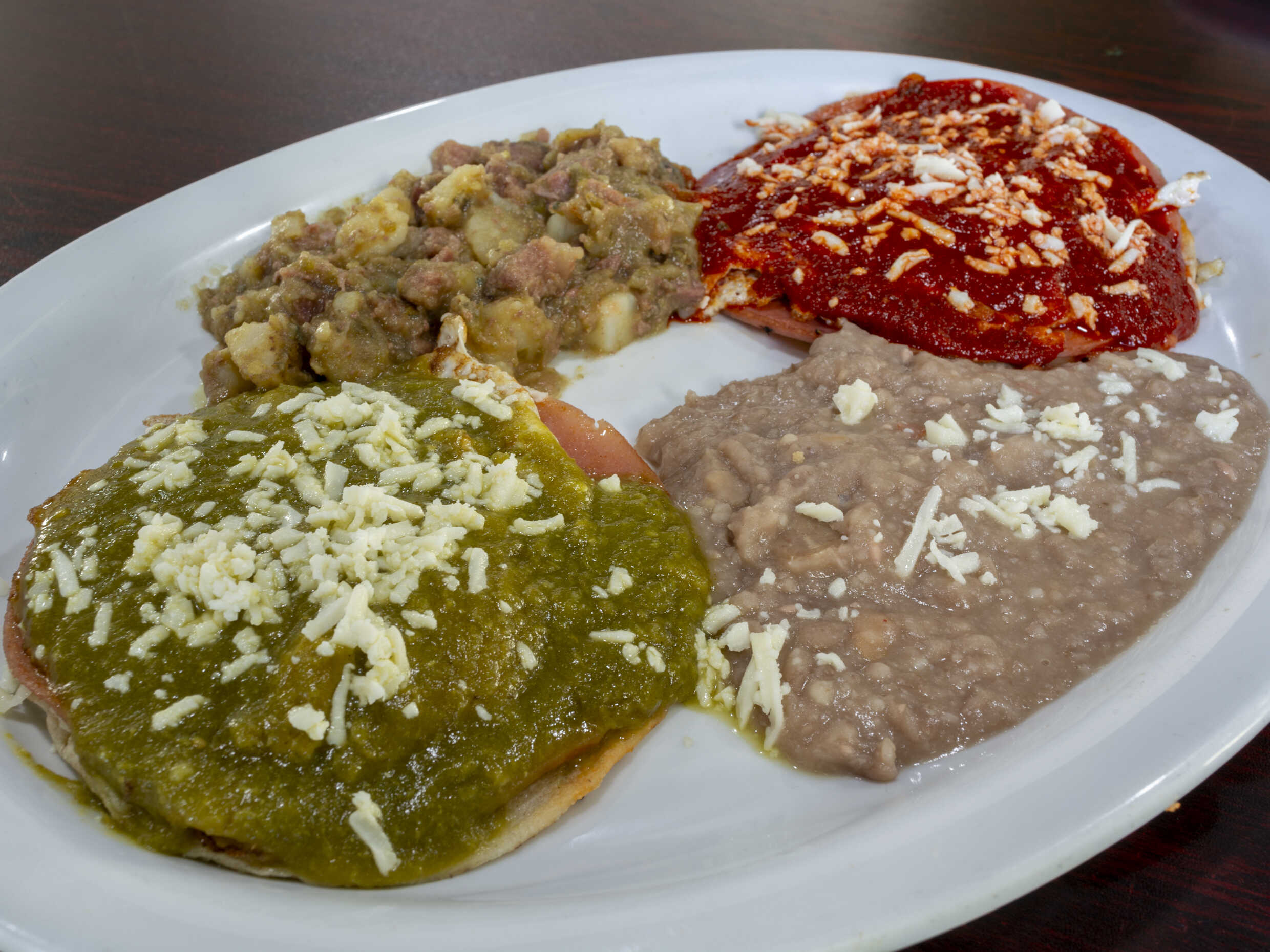 Montados sobre tortilla dorada y con cama de jamón, bañados en salsa roja y verde y un toque de mexicana, acompañados de frijoles y guisado.