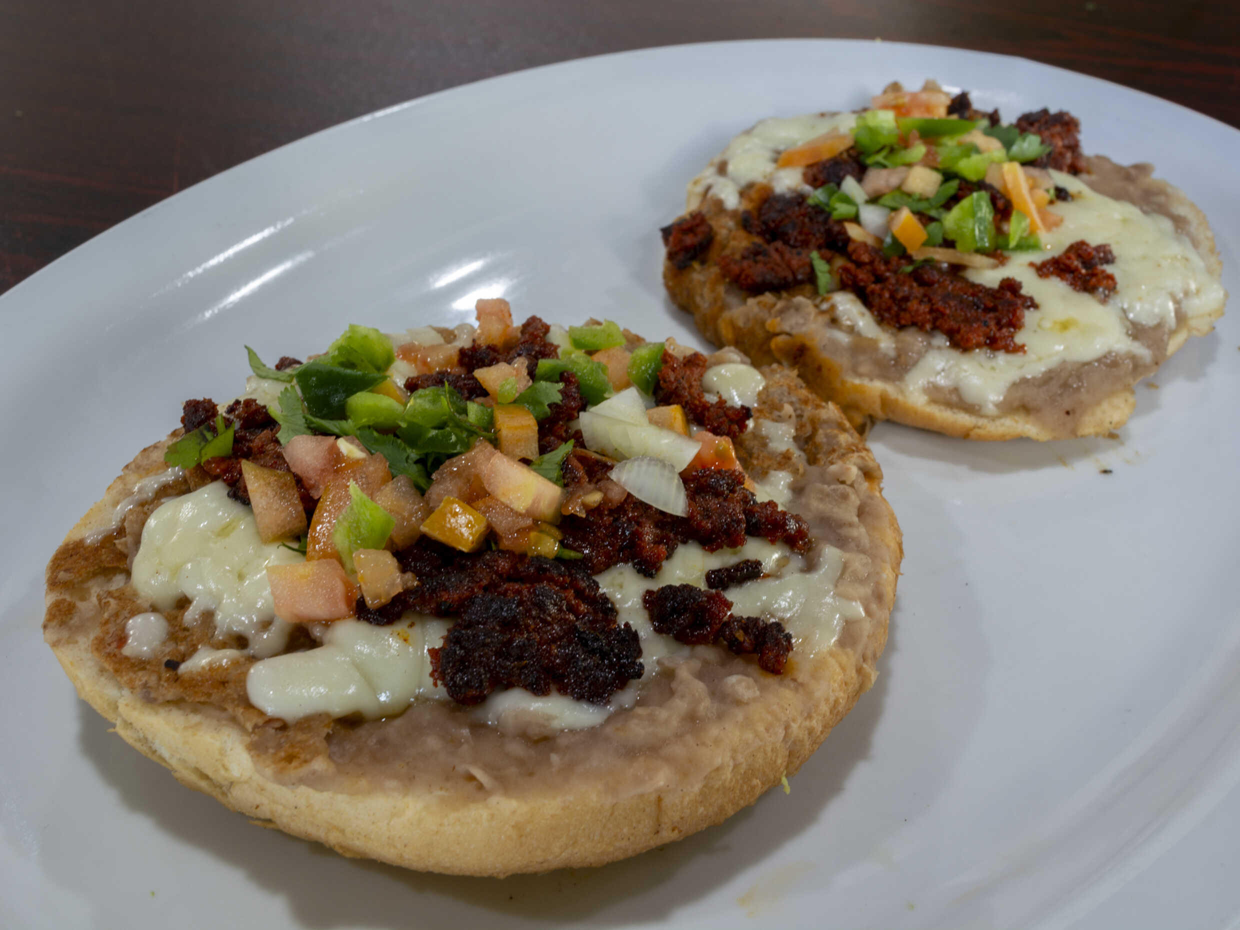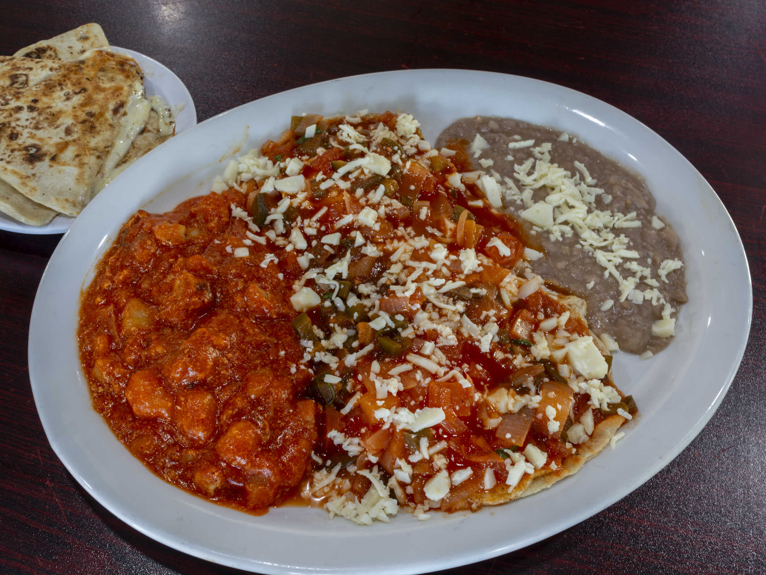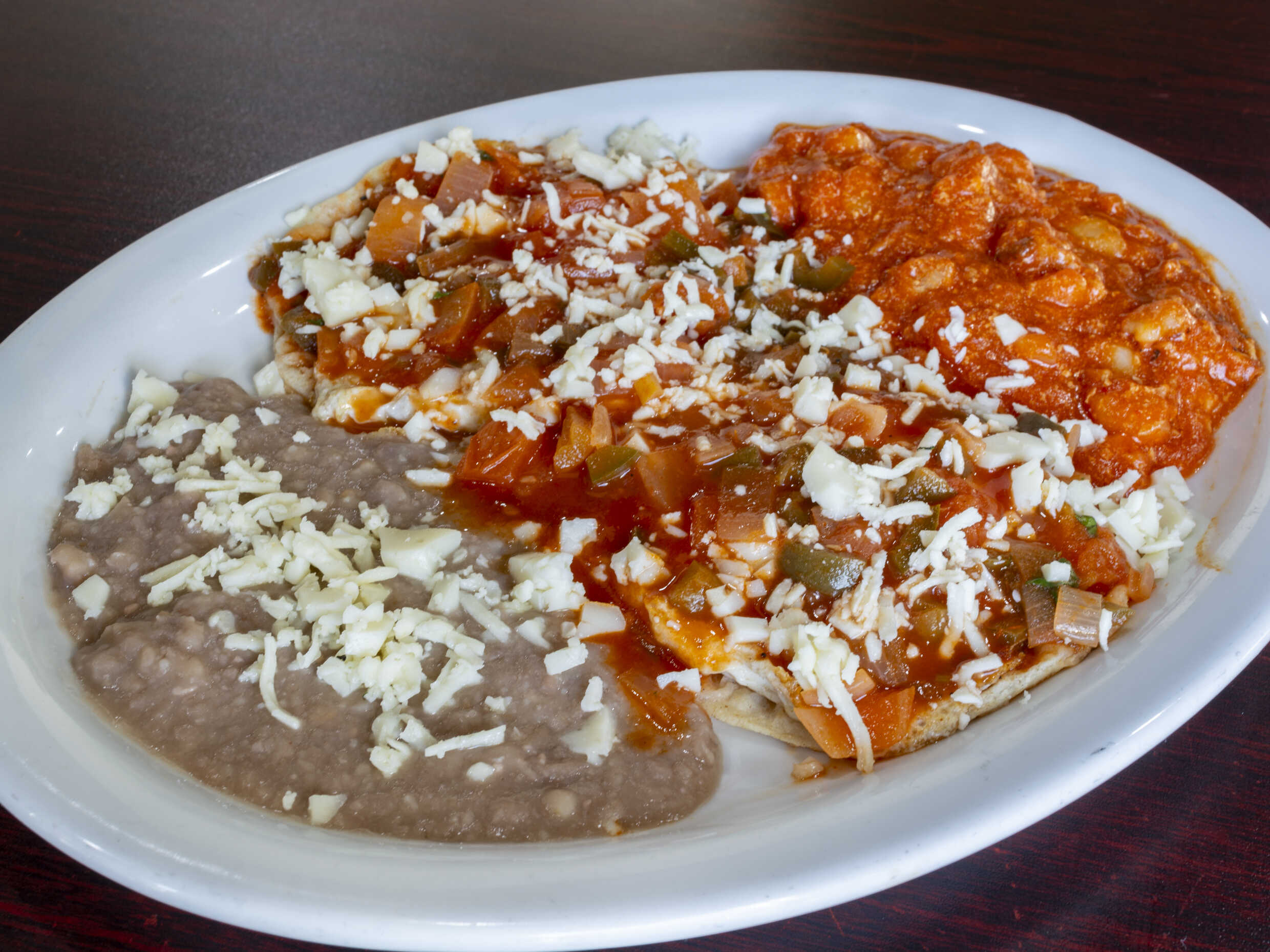 Montados sobre tortilla freída, bañados en salsa ranchera, acompañados de frijoles, guisados y quesadillas de maíz o harina.