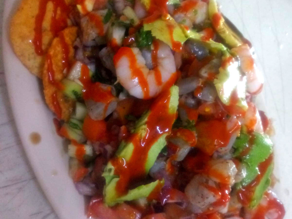 Camarón, pulpo, pescado, con nuestra salsa especial caliente.