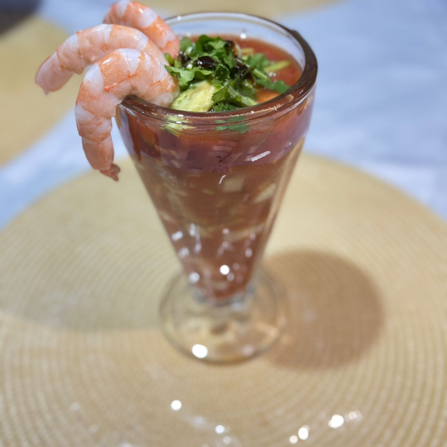 Vaso de 20Oz: 130grm de camarón acompañado de cebolla, pepino y aguacate, especias y salsas picositas de la casa