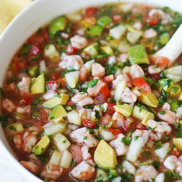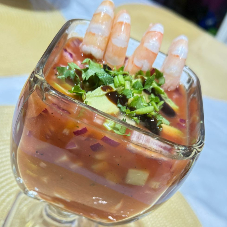 Delicioso ceviche de camaron, cebolla morada, pepino, tomate, limon, mescla de salsas, clamato y tostitos a elegir