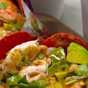 Vaso de 32 0z: 180gramos de Camarón, Calamar, Ostión) pepino, apio, cebolla, cilantro, aguacate y limón y mezcla de salsas. galletas o totopos