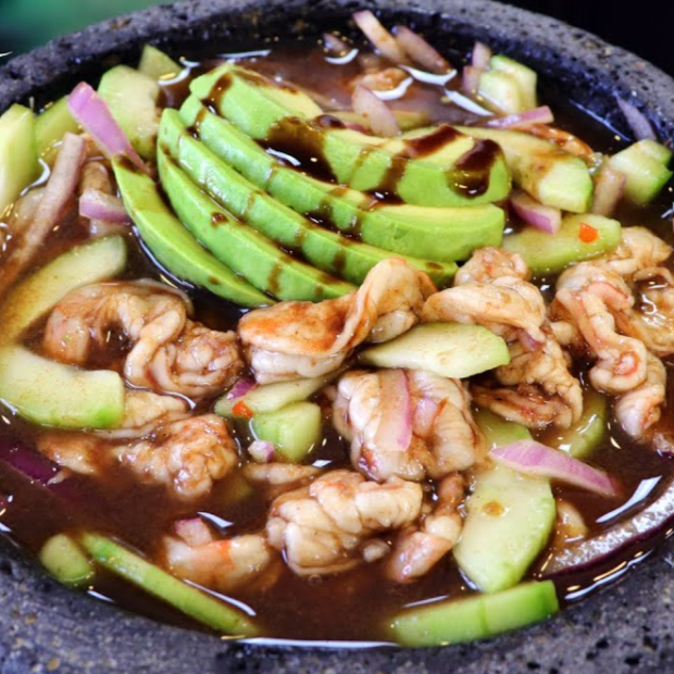 camaron, limon, cebolla morada, pepino, apio, salsas de la casa y totopos o tostadas