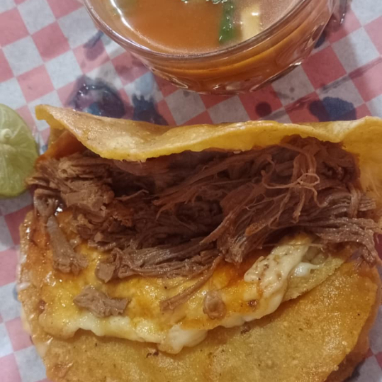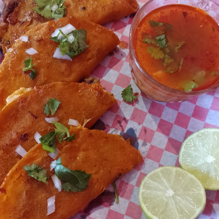 Quesadilla con carne de Birria 100% de Res, 4pzas incluye: consomé, salsas, cebolla/cilantro, limón