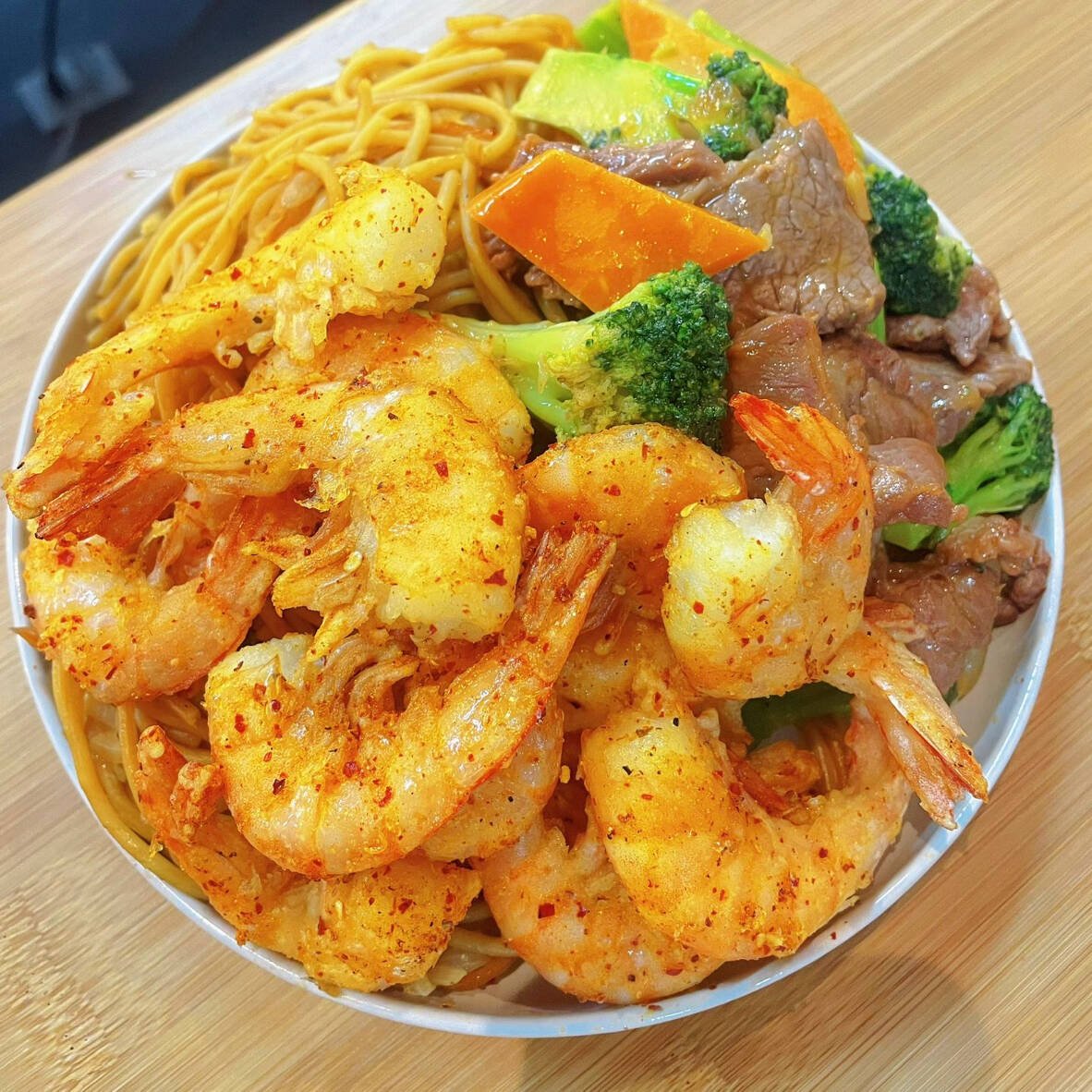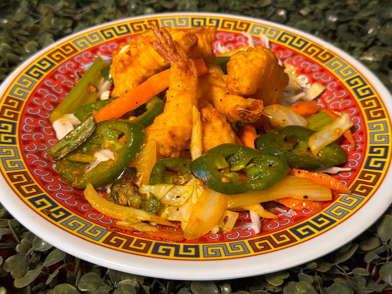 Camarones crispy acompañados de verdura salteada y un toque de jalapeño.