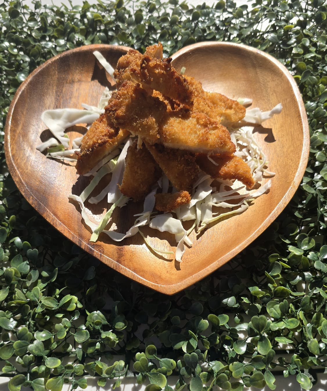 Pollo sazonado y empanizado, cortado en tiras. ¡Una opción crujiente y llena de sabor!