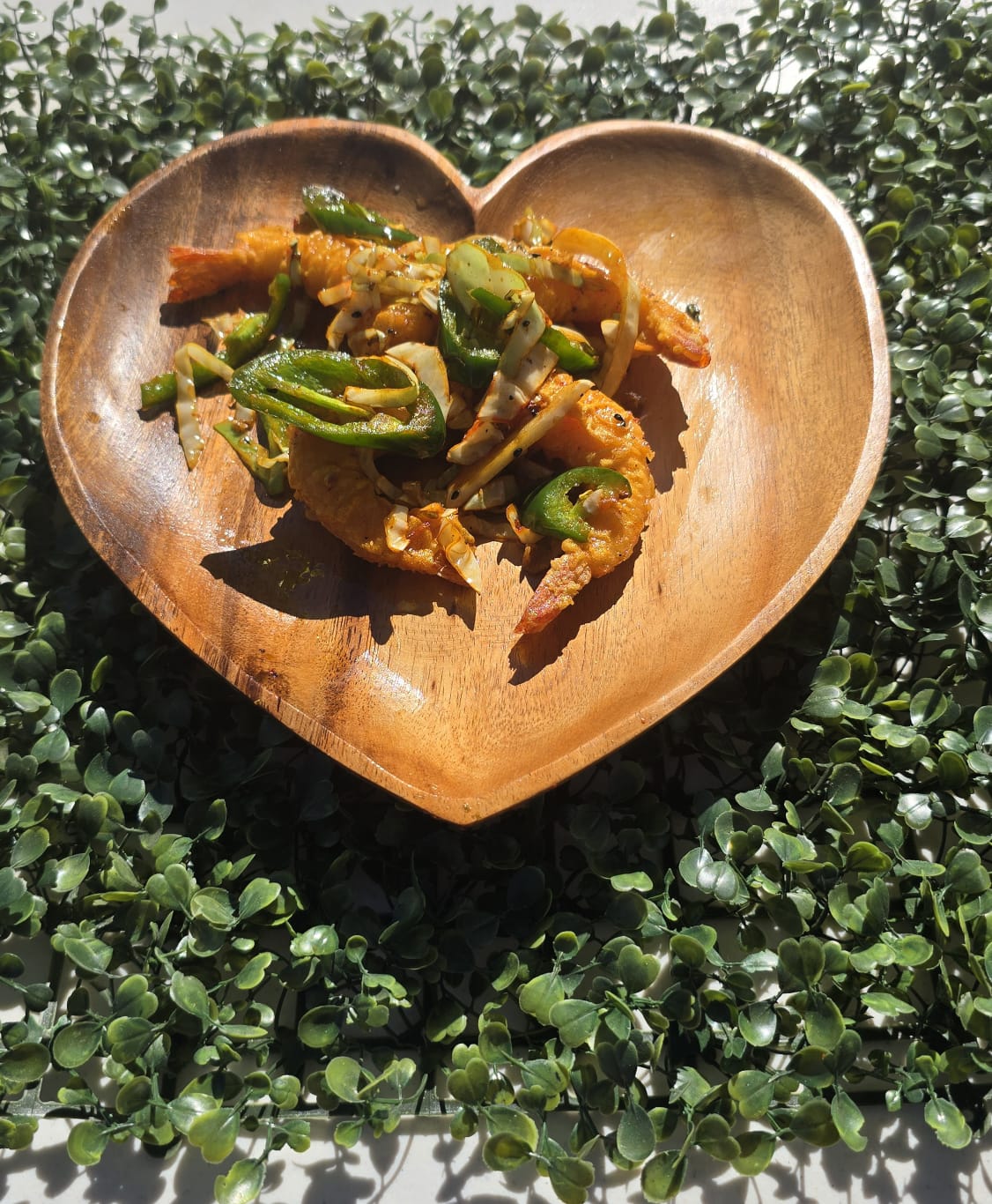 Camarones crispy acompañados de verdura salteada y un toque de jalapeño.