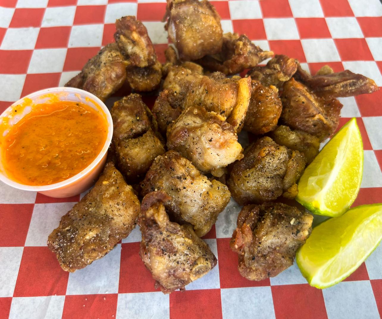 Costillitas de cerdo fritas sazonadas con el sazonador especial de la casa (226g) y salsa habanera.