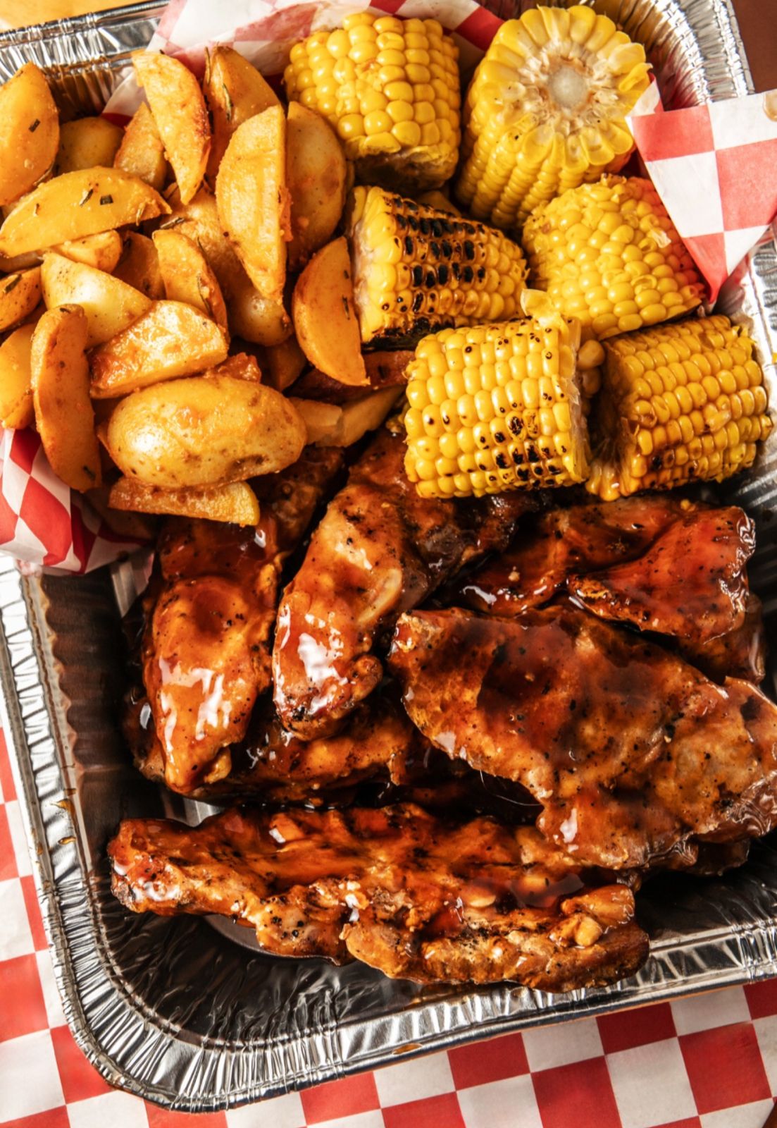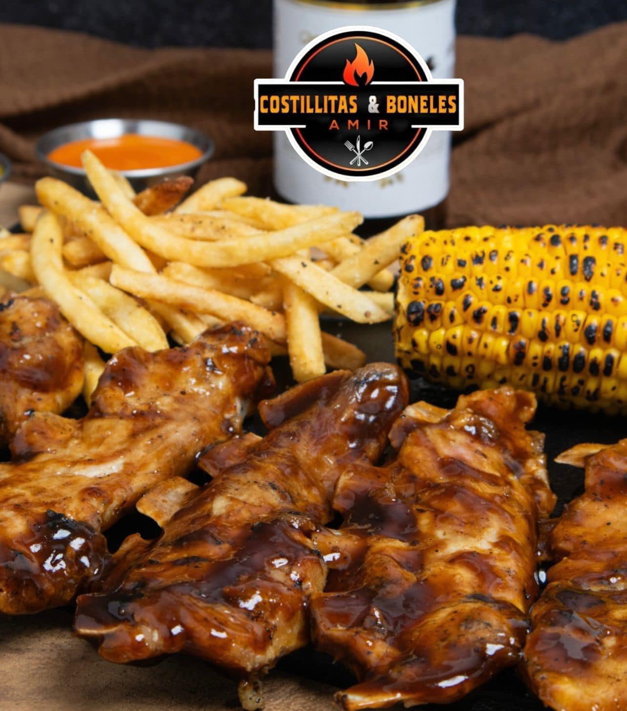 costilla baby back ahumada bañada en tu salsa favorita, acompañada de elote amarillo y papas fritas