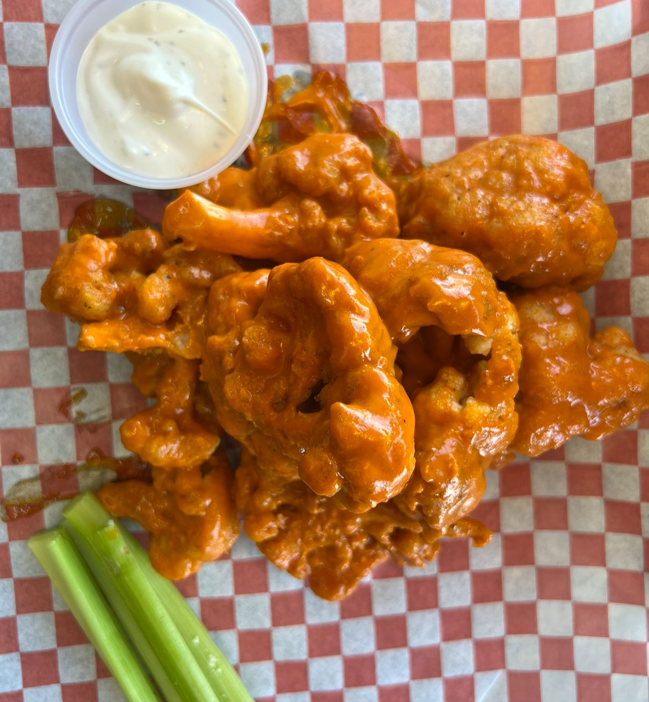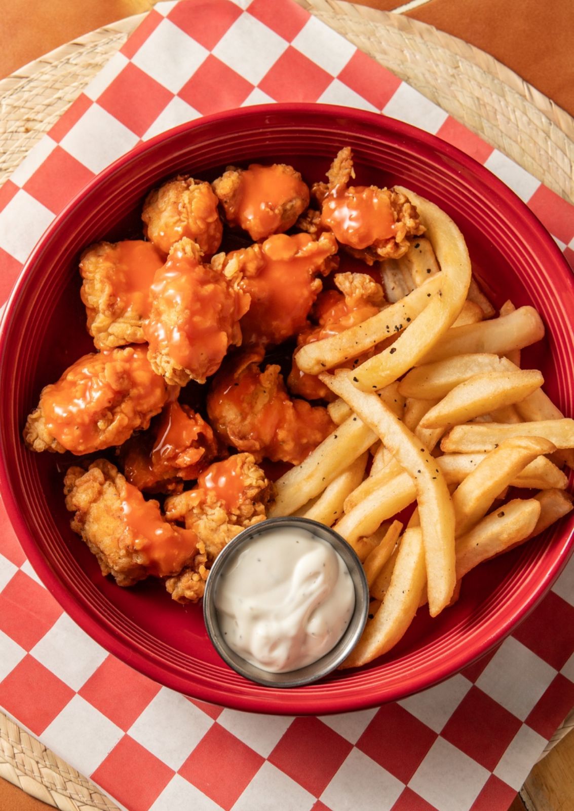 Crujientes trocitos de pechuga de pollo ligeramente empanizados bañados en su salsa favorita, acompañado de papas fritas, apio y aderezo ranch. 1 kg de boneless.