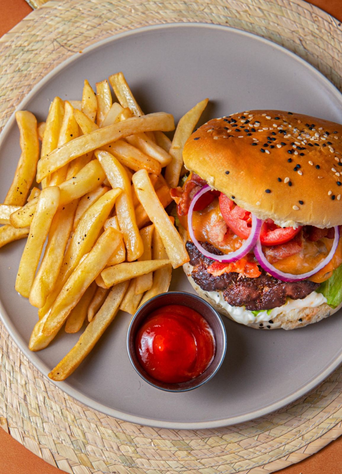 Deliciosa hamburguesa con carne de sirloin queso cheddar amarillo, lechuga, tomate, cebolla y pepinillos acompañada de papas fritas.