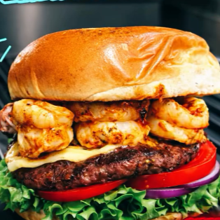 RES JUGOSA + CAMARONES SARANDEADOS, ADEREZO DE LA CASA, DOBLE QUESO Y CEBOLLA CARAMELIZADA