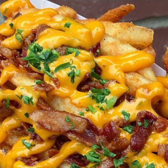 320gms de papas fritas, bañadas en queso cheddar, chiles toreados picados y tocino.