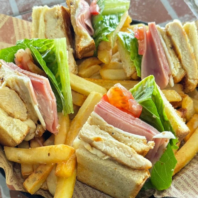 POLLO, JAMON, TOCINO, MANCHEGO, Y VEGETALES FRESCOS, EN PAN BRIOCHE DE BARRA