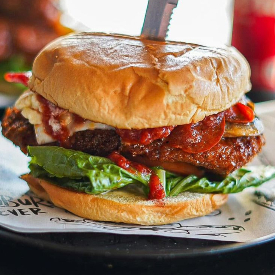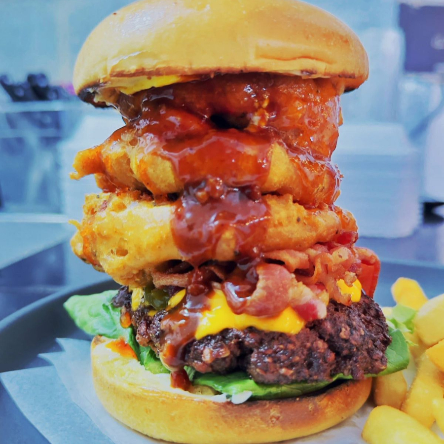 CARNE DE RES JUGOSA, AROS DE CEBOLLA HECHOS EN CASA, TOCINO CRUJIENTE Y SPICY BBQ PARA UN TOQUE PICANTE