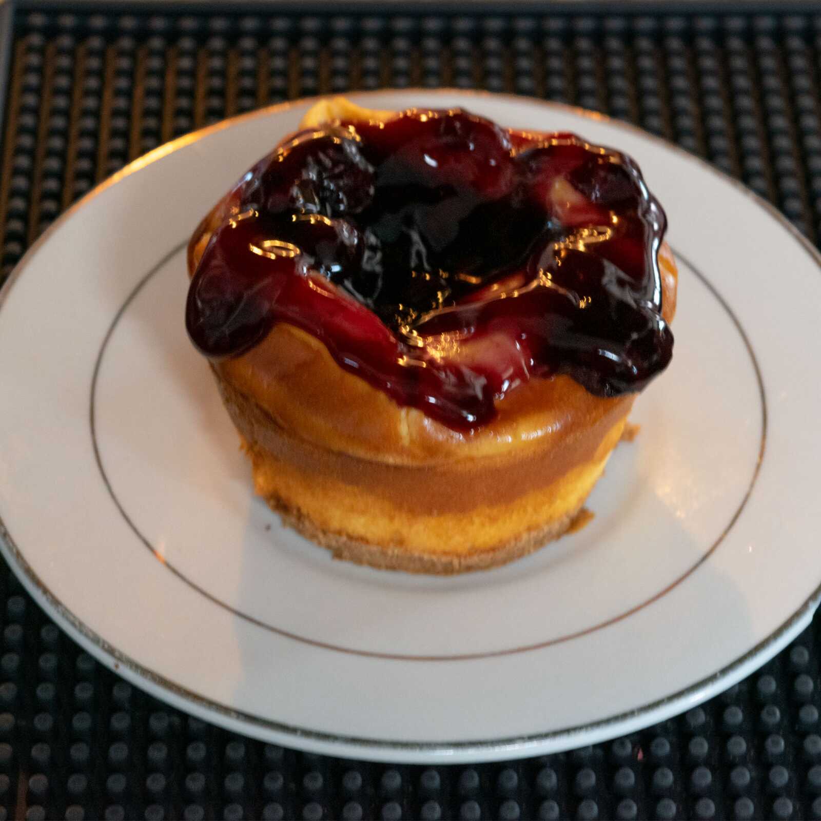 Pie de queso casero cubierto de mermelada.