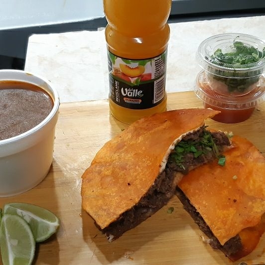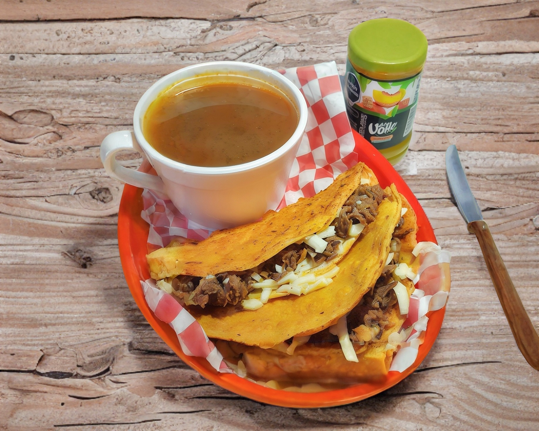 2 Quesabirrias, Consome, Postre del Dia, Jugo Jumex Lata.