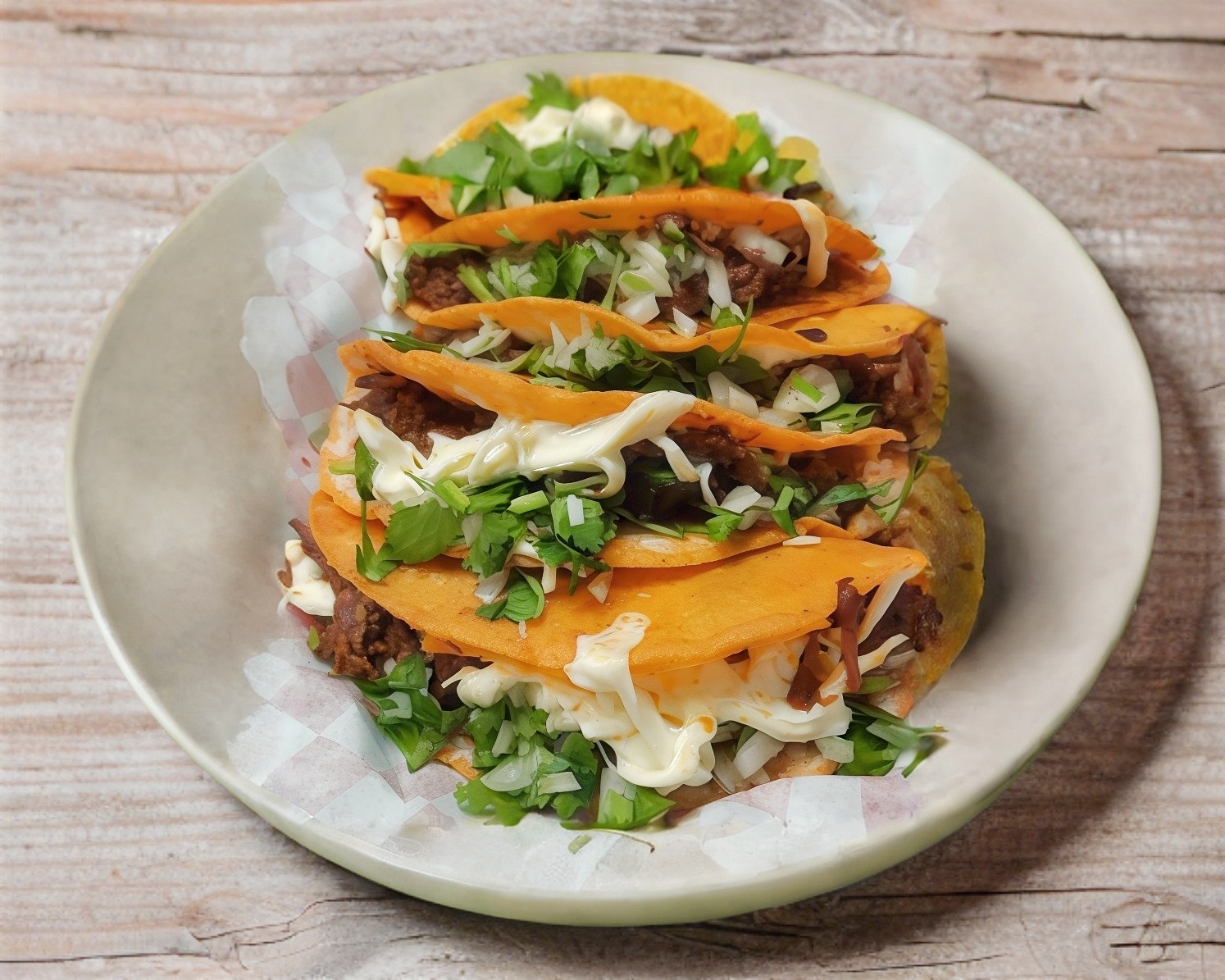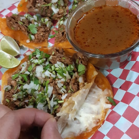 2 Gringas Dobles de Harina, Queso, Birria, Consomé, Salsa y Verduras.