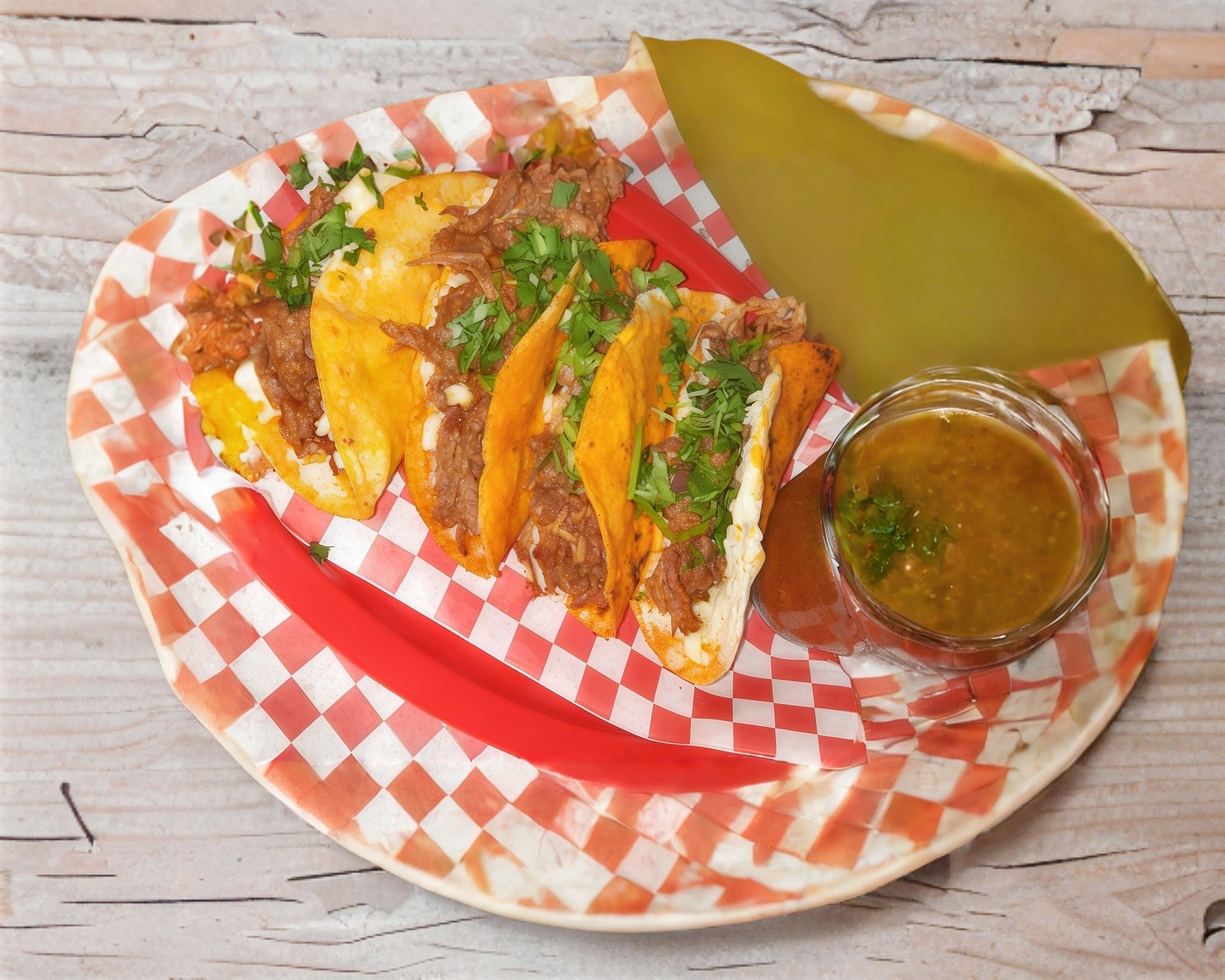 5 Quesabirrias de Maiz, Consome, Verduras, Salsa.