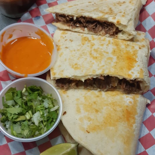 2 Quesadillas de Harina GRANDES, Queso, Birria de Res, Verduras y Salsa.