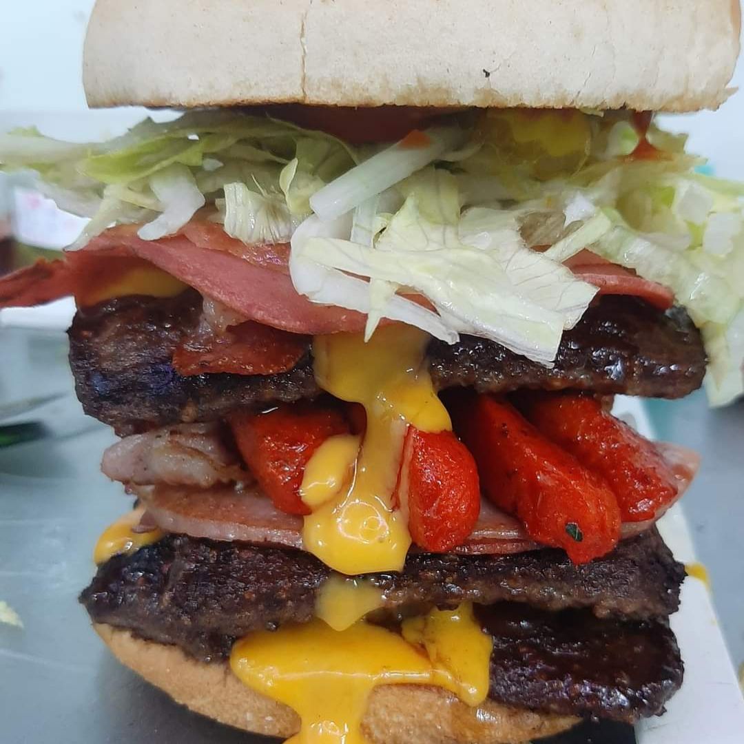 2 carnes de Sirloin, aguacate, jamón, salchichón, queso blanco, mostaza, mayonesa, catsup, pepinillos, tomate, cebolla, lechuga.