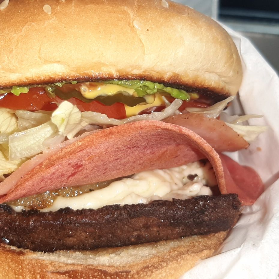 Carne de Sirloin, tocino, queso blanco, jamón, salchichón, aguacate, tomate, pepinillos, cebolla, lechuga, mostaza, mayonesa y catsup.
