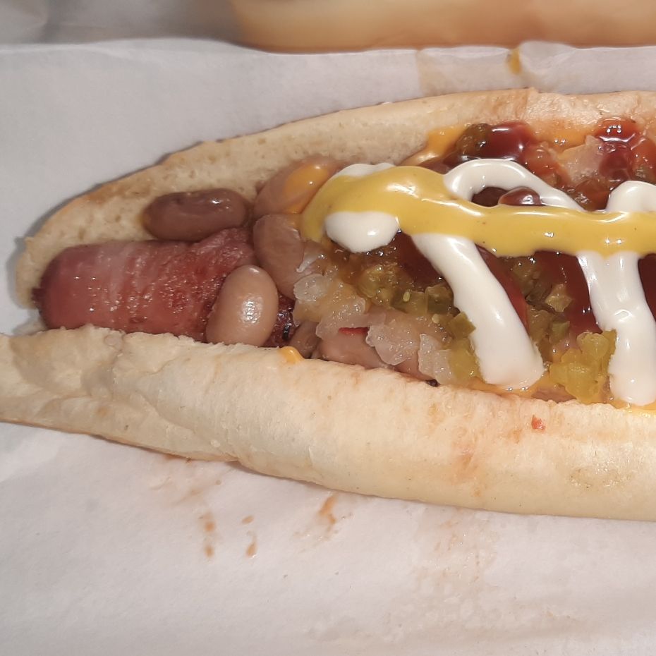 Salchicha americana envuelta en tocino, frijoles, queso amarillo, pepinillos, cebolla, salsa verde, mostaza, catsup y mayonesa.