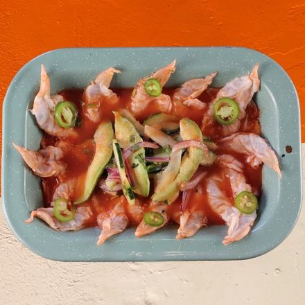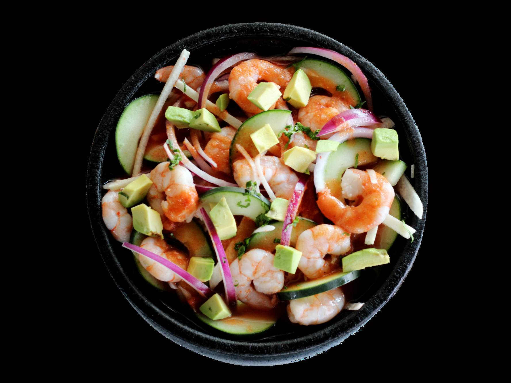 Camarón curtido en limón, salsa de la casa con ari, chile chiltepín, cebolla, chile de árbol, chile serrano, cebolla, pepino y aguacate.