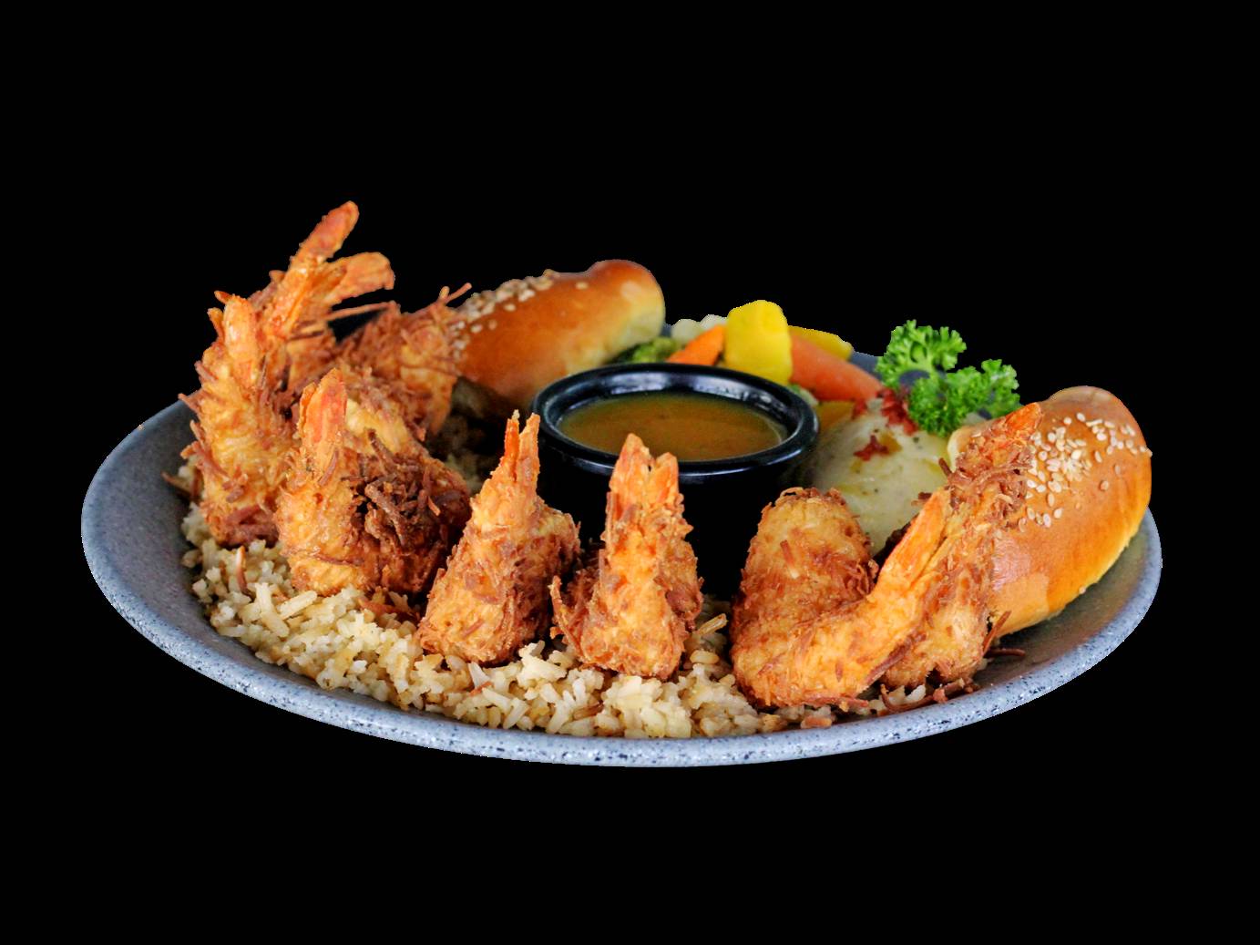 camaron empanizado con coco acompanado de salsa mango