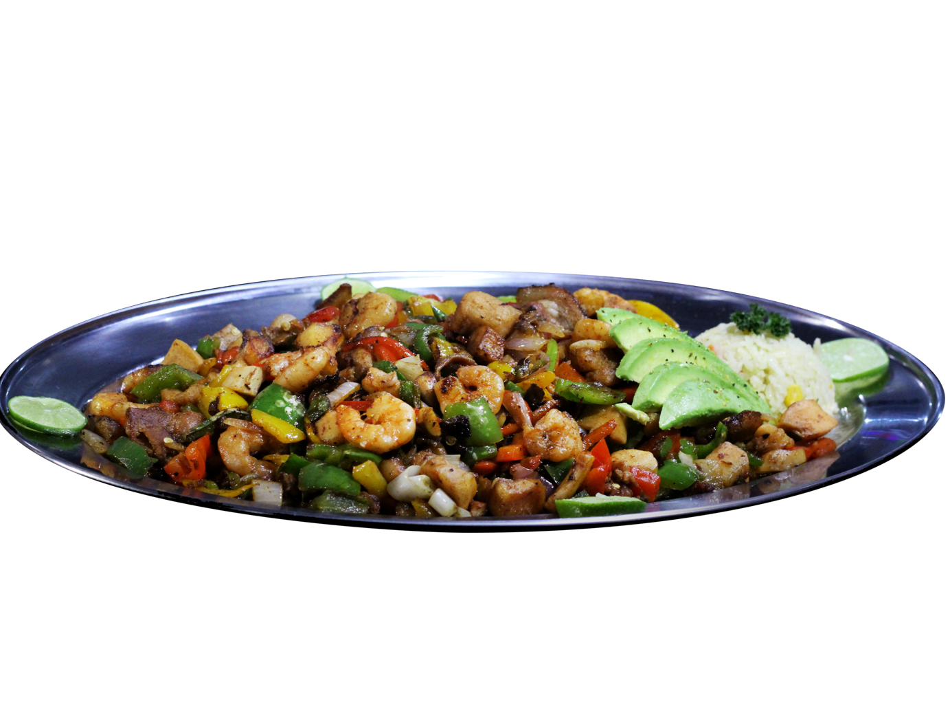 plato sampler chile relleno de camaron camaron fiesta camaron philadelfia servido con pimientos calabaza tomate salteados
