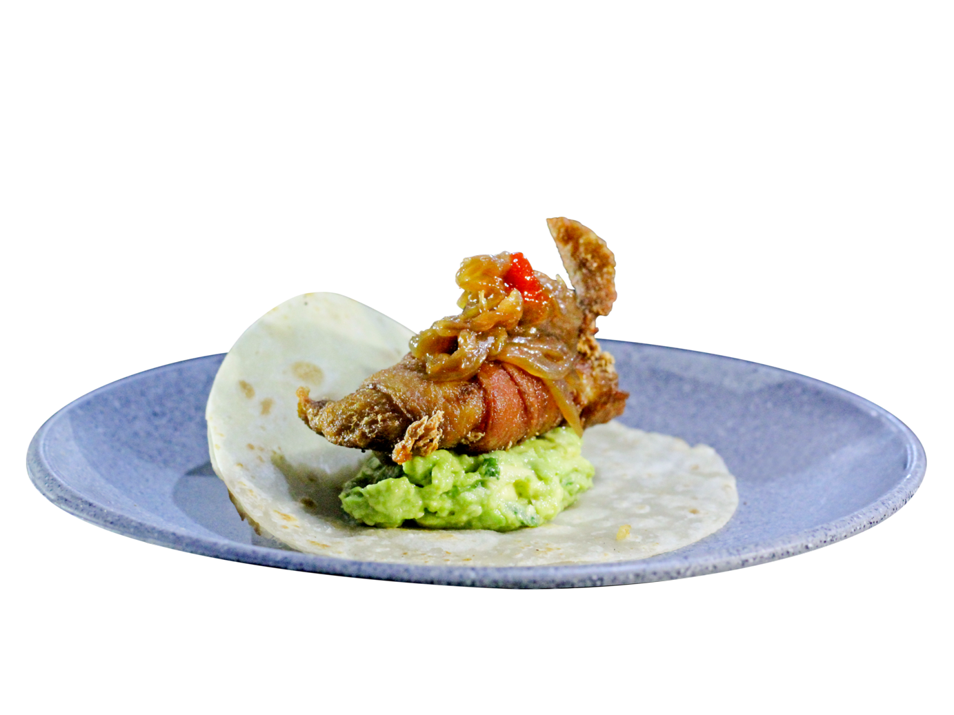 tortilla de maiz camaron relleno de queso philadhelfia capeados y mix de col aguacate y salsa de anguila