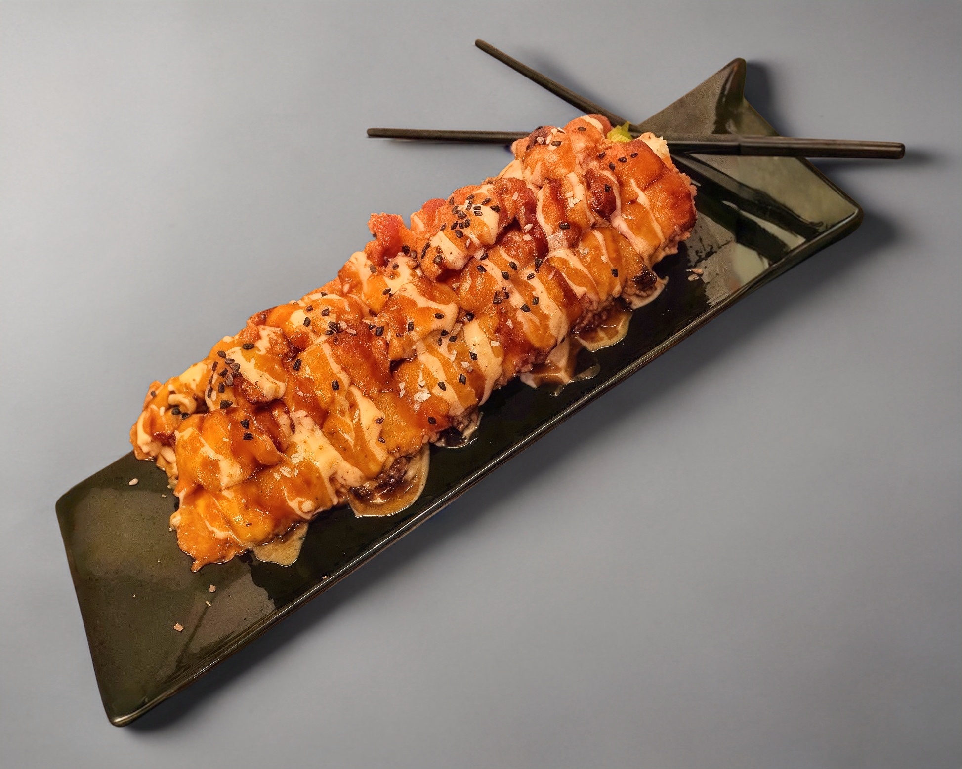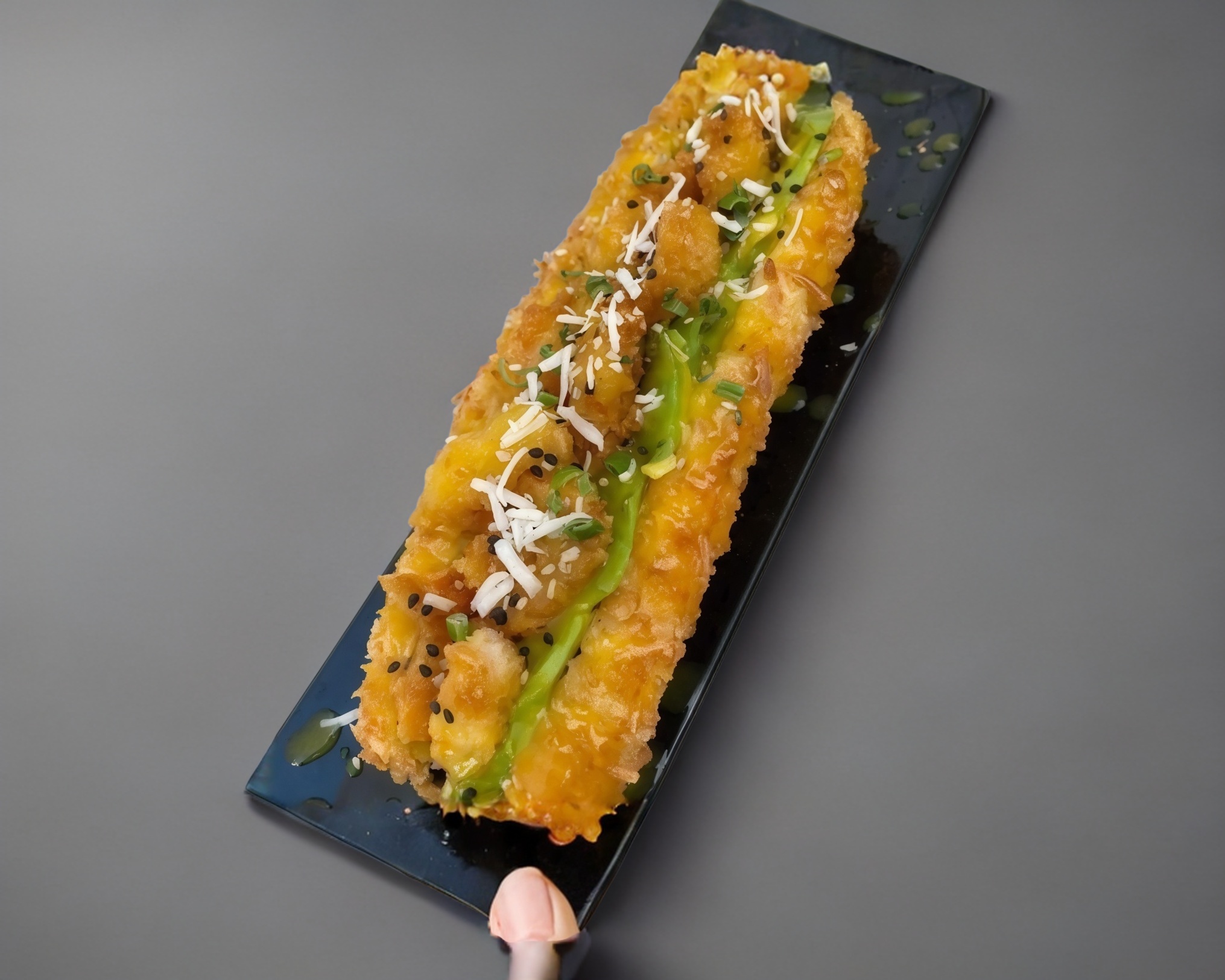 queso crema, aguacate, surimi, camaron empanizado y salsas anguila y chipotle