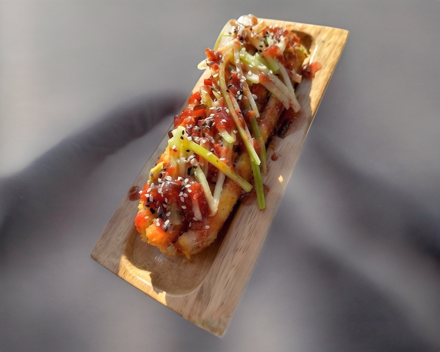queso crema, aguacate, pepino, camaron empanizado, salsa mango habanero y coco