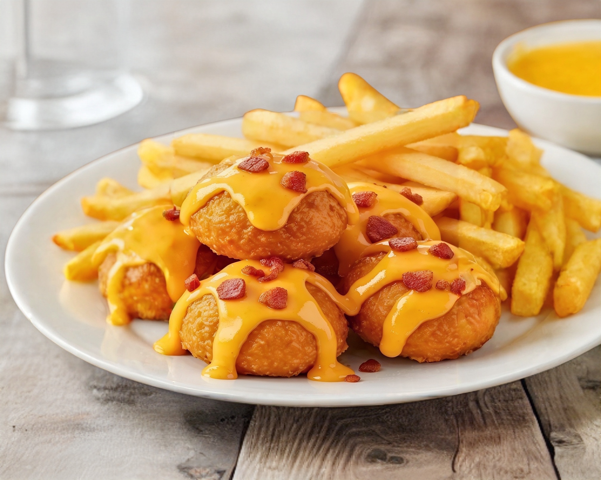 300 GRAMOS DE BONELESS BAÑADOS EN QUESO CHEDDAR CON TROCITOS DE TOCINO SECO,ACOMPAÑADO DE PAPAS FRITAS