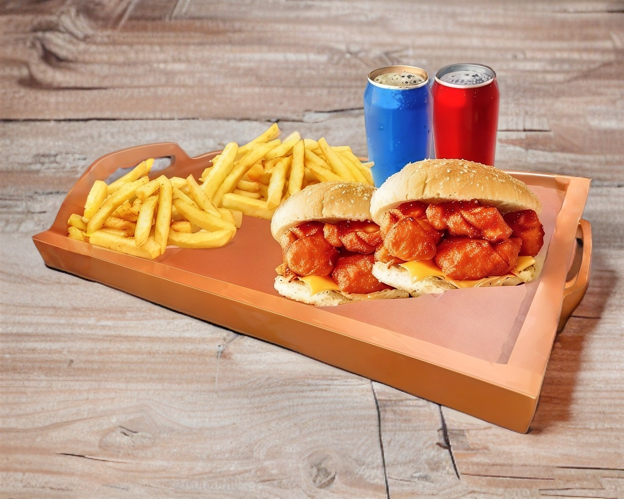 2 HAMBURGUESAS DE CRUJIPOLLO, CON 2 PAPAS FRITAS Y 2 BEBIDA