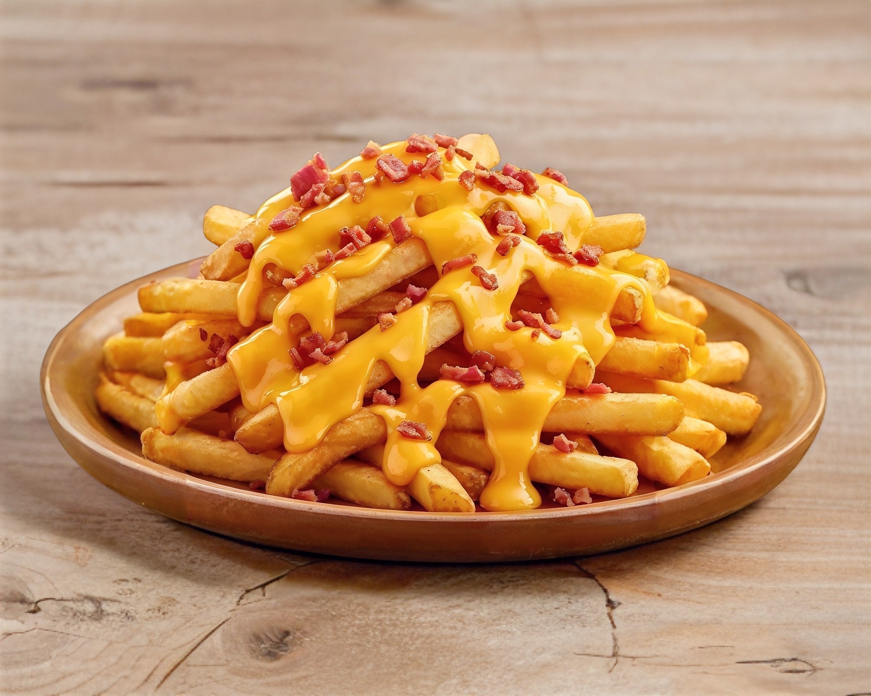 300 GRAMOS DE PAPAS FRITAS BAÑADAS EN QUESO CHEDDAR Y TROCITOS DE TOCINO SECO