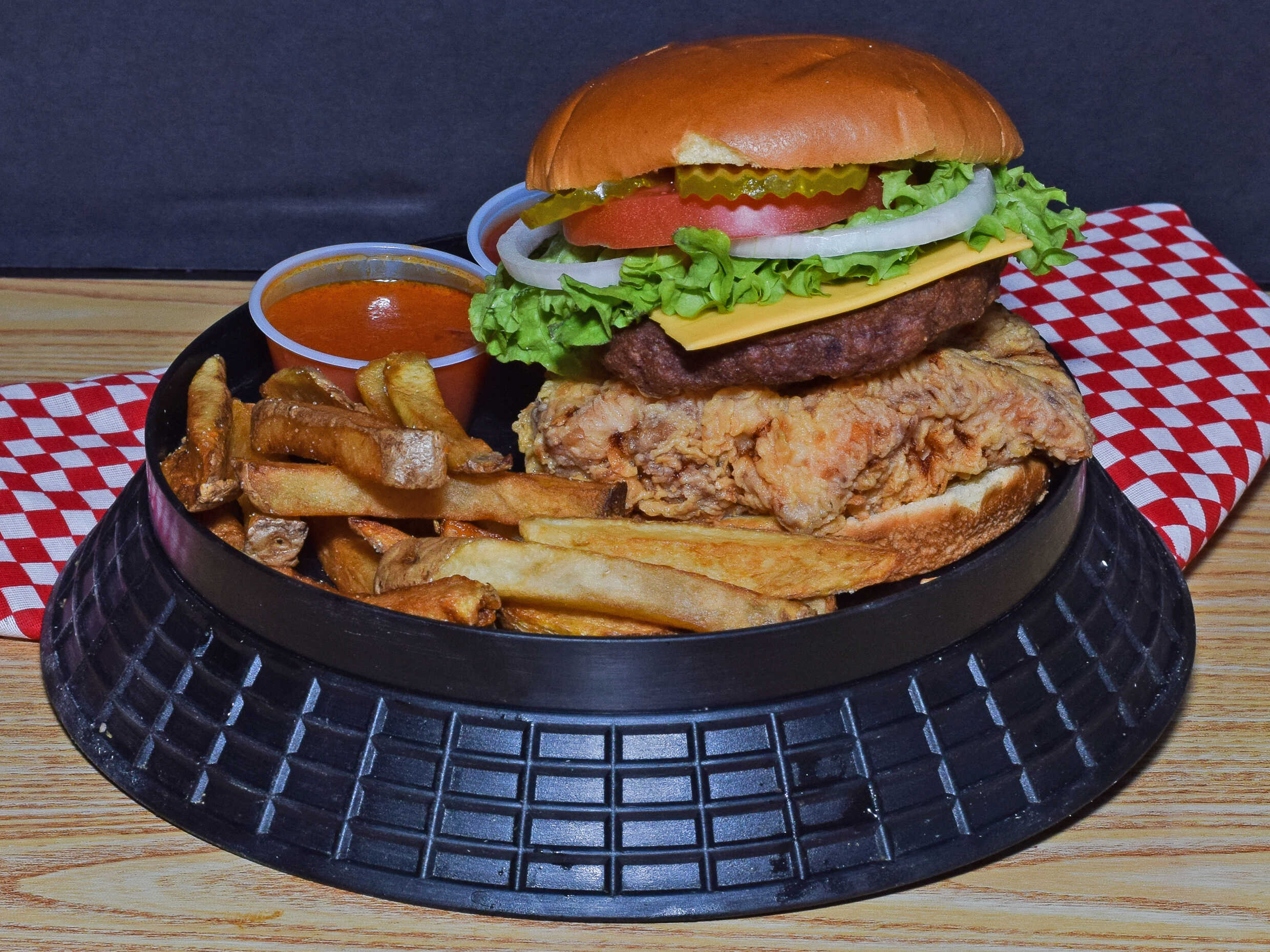 Hamburguesa de 100% pechuga de pollo empanizada y carne de Sirlon con queso amarillo derretido, acompañada con papas clásicas chicas de corte natural. Lleva lechuga, tomate, pepinillos, queso amarillo, mayonesa, mostaza y kétchup.