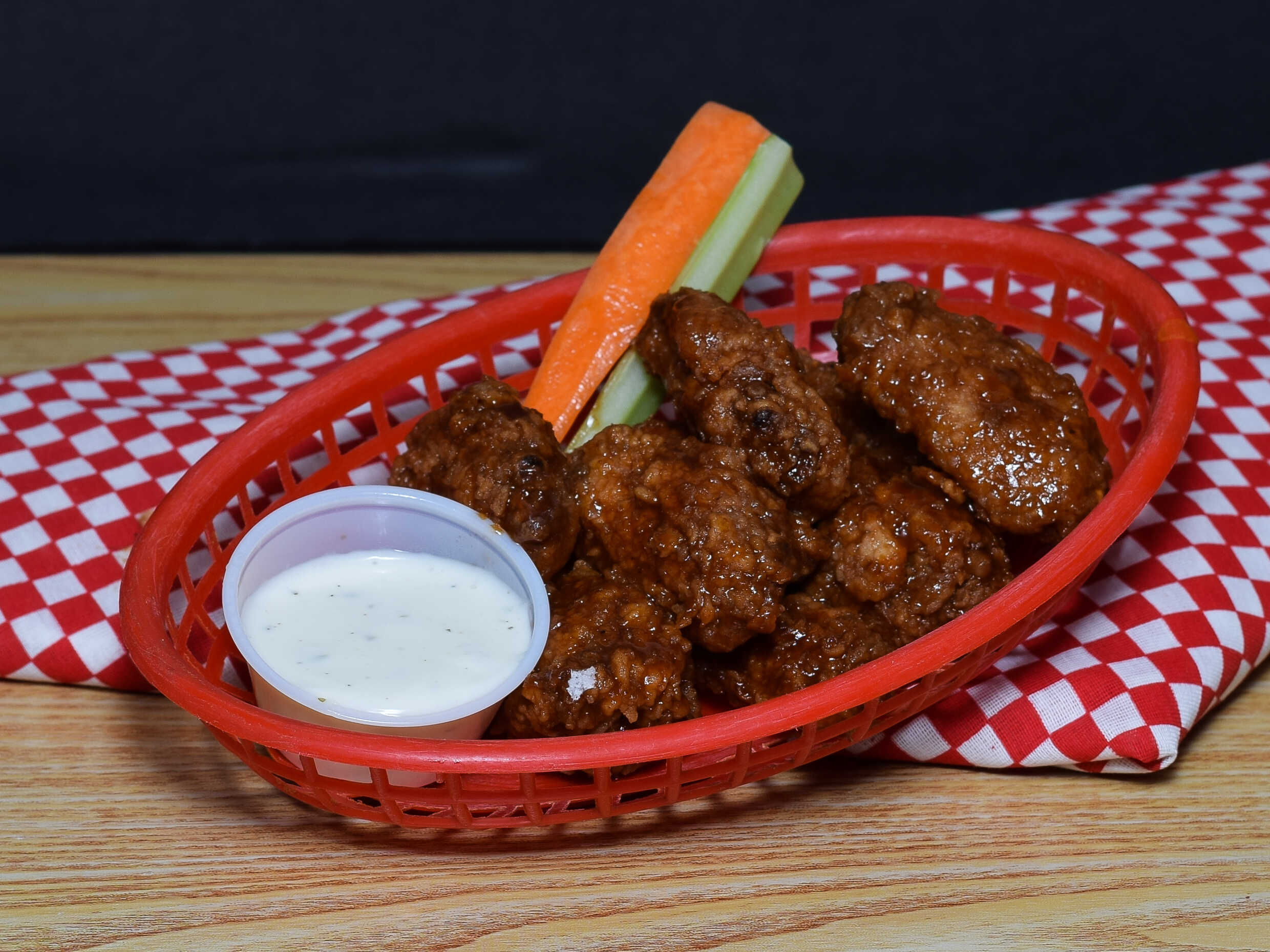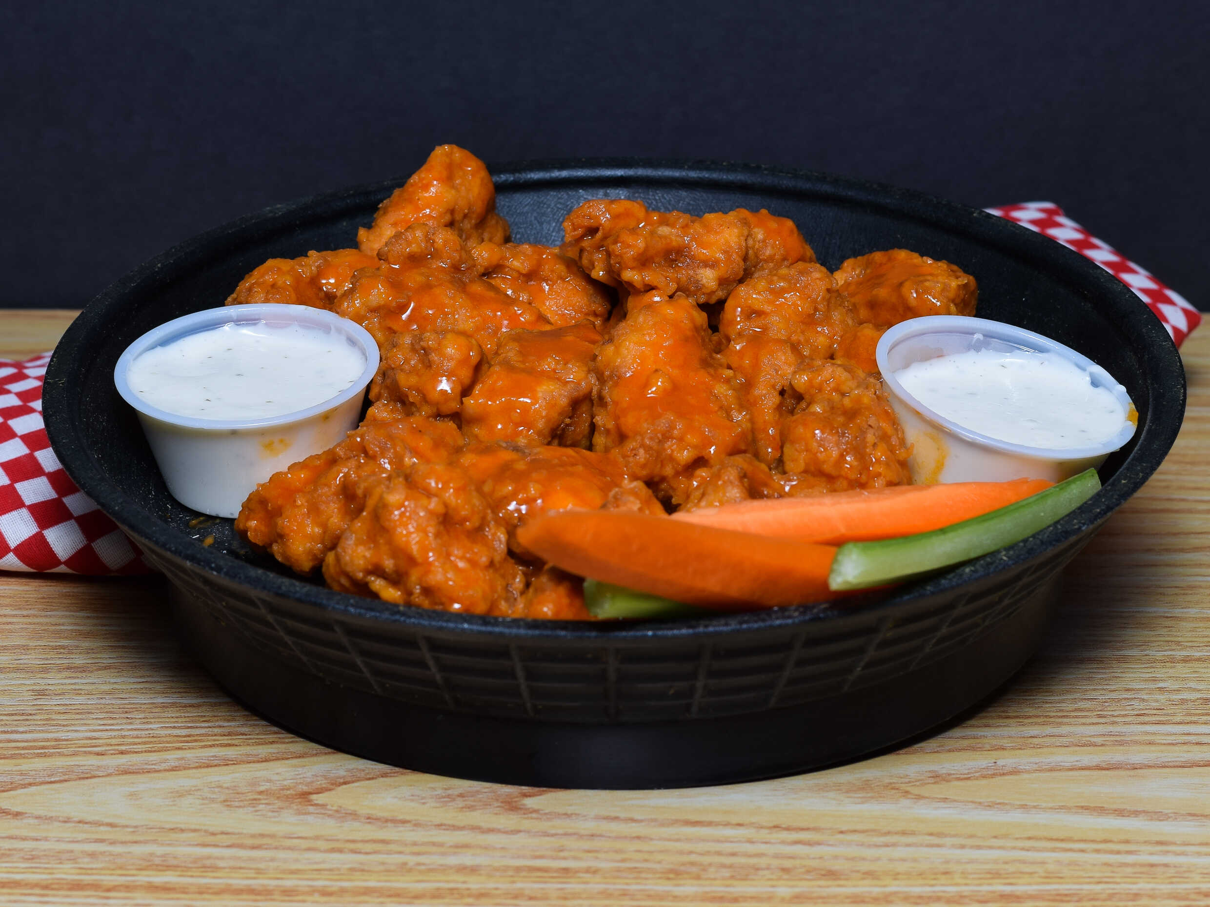 10 Chicken Poppers (Boneless) de jugosa 100% pechuga de pollo, empanizados y bañados en una de nuestras salsas, acompañados con papas chicas naturales clásicas a la francesa (100grms). Incluye 1 refresco a elegir (355mL), 1 aderezo ranch (2oz) apio y zanahoria (1/1).