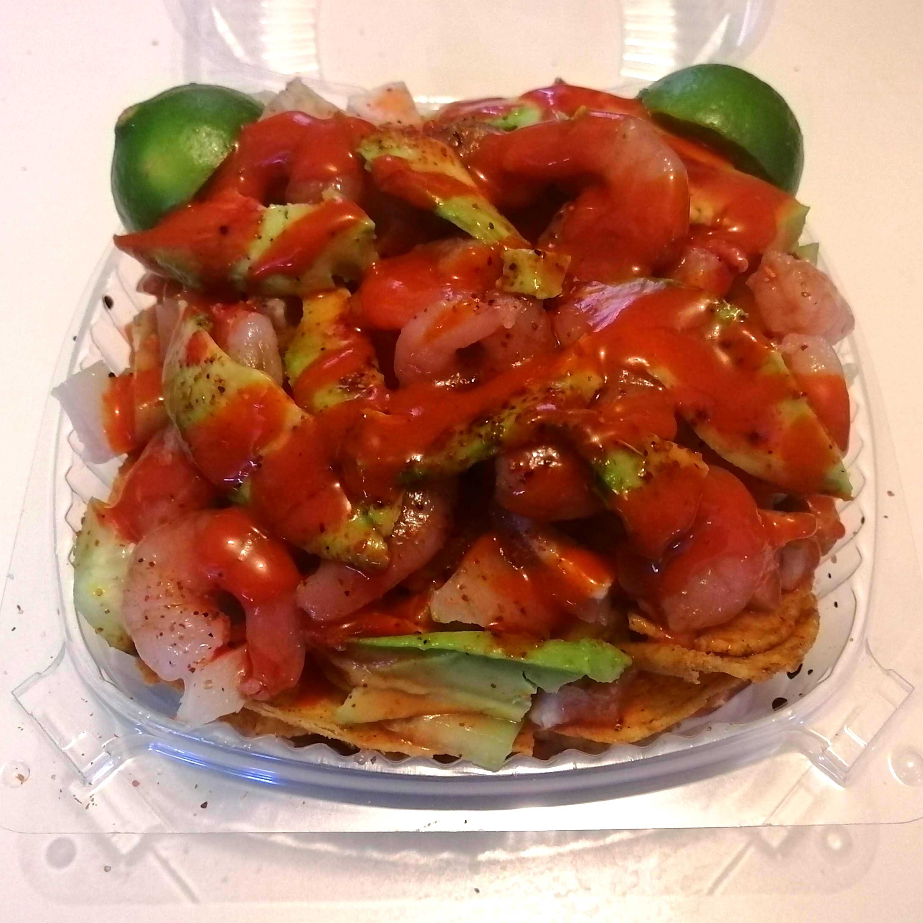 Tostitos morados o verdes, Camarones, cacahuates, cueritos, pepino, dulces de tamarindo, chamoy, salsa soya, valentina, aguacate, limon y clamato
