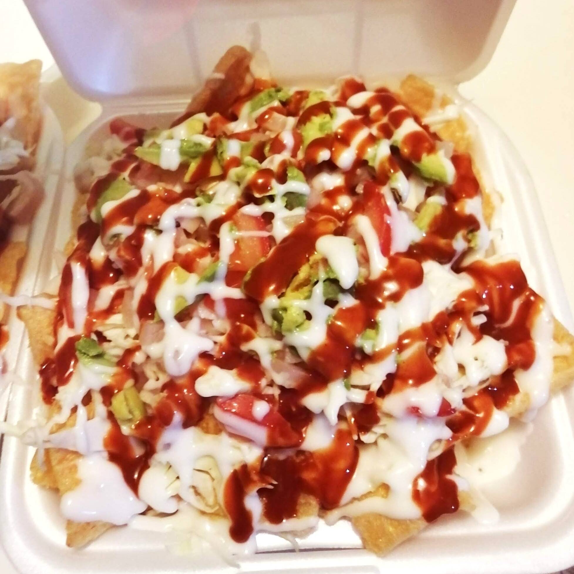 Chicharron de arina, repollo, cueritos, tomate, aguacate, crema y salsa valentina