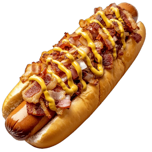 Hotdog de tamaño regular con salchicha de pavo frita, tocino, tomate, cebolla morada y liquidos (Catsup, mayonesa y mostaza)