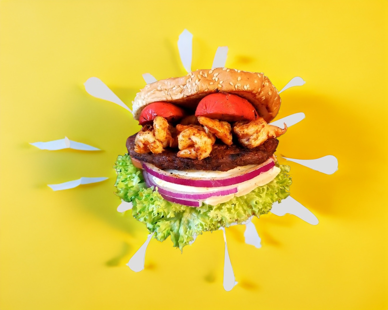 Todo el sabor de nuestra hamburguesa preferida con pan tradicional para hamburguesa con exquisita carne de res acompañada de deliciosa salchicha para asar con tocino doradito, el toque del mar agregando camarón salteado con cebolla caramelizada, lechuga, jitomate, cebolla, rajas, mayonesa, mostaza y catsup.