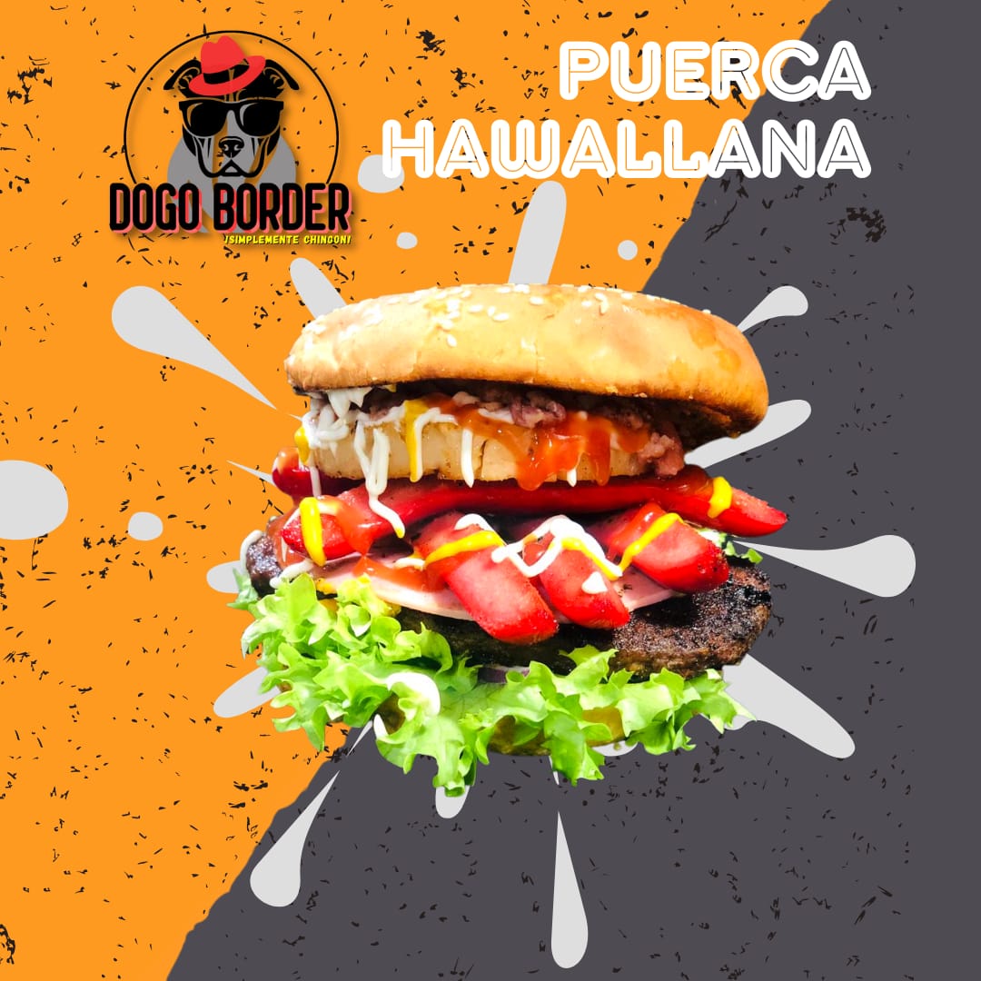 Pan tradicional para hamburguesa con exquisita carne de res acompañada de deliciosa salchicha para asar con tocino doradito, piña, jamón, queso amarillo, lechuga, jitomate, cebolla, rajas, mayonesa, mostaza y catsup.
