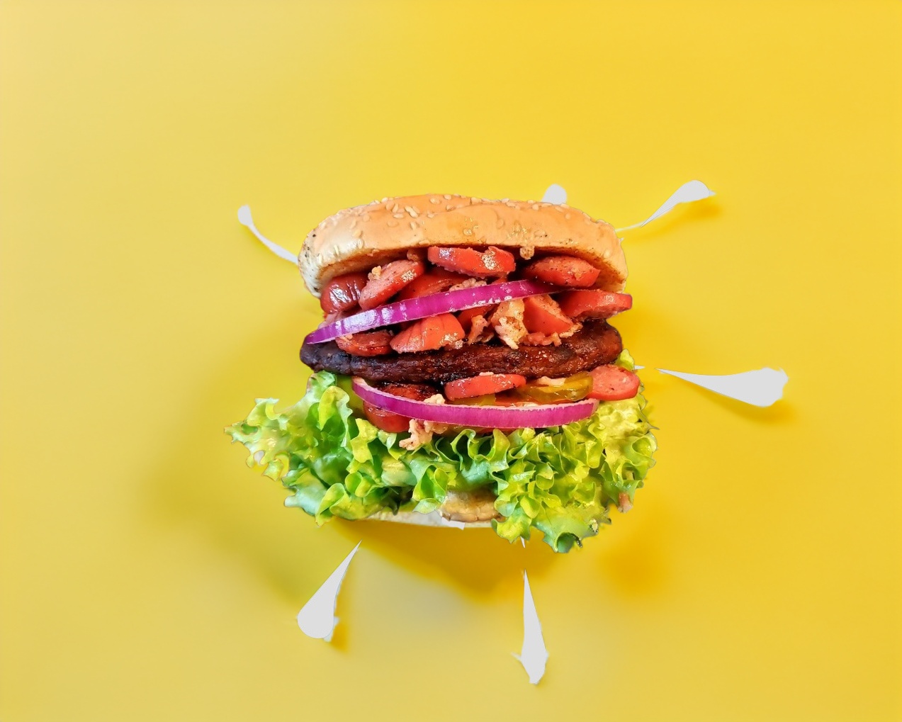 Pan tradicional para hamburguesa con exquisita carne de res acompañada de deliciosa salchicha para asar con tocino doradito, lechuga, jitomate, cebolla, rajas, mayonesa, mostaza y catsup.