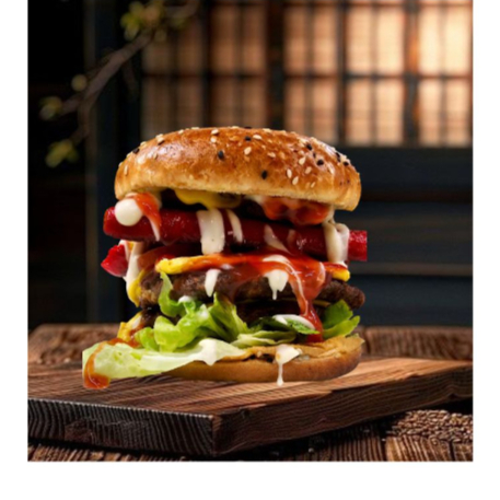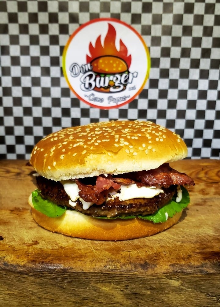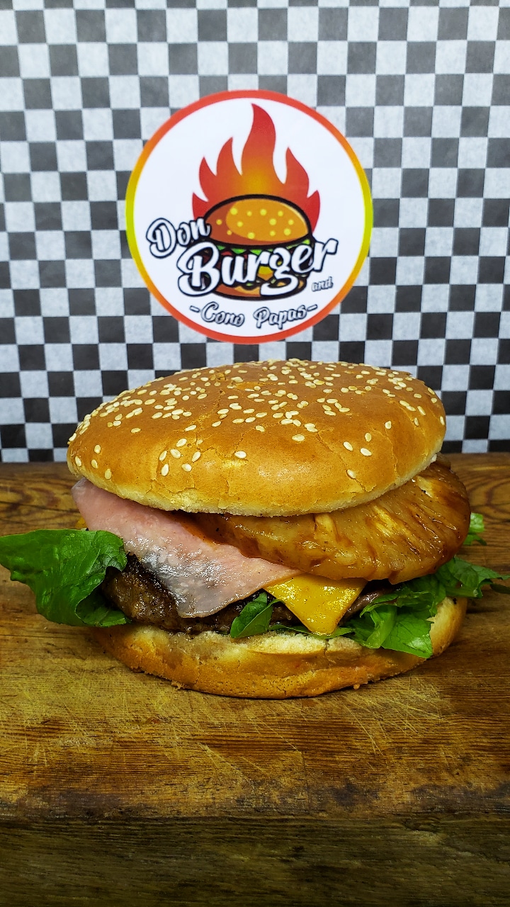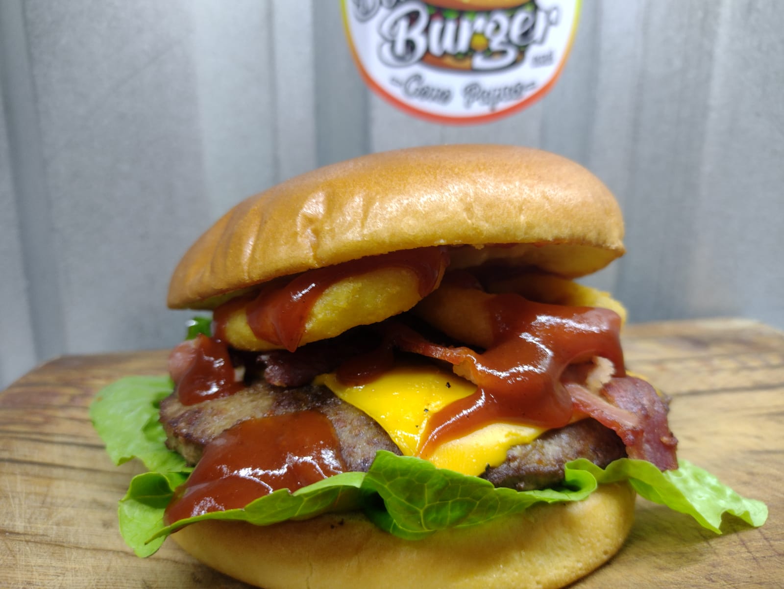 Carne aprox. 150 gr, queso amarillo, aros de cebolla, tocino, salsa barbecue , vegetales y líquidos