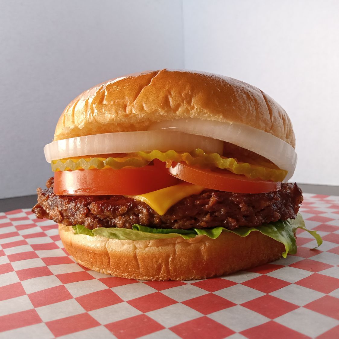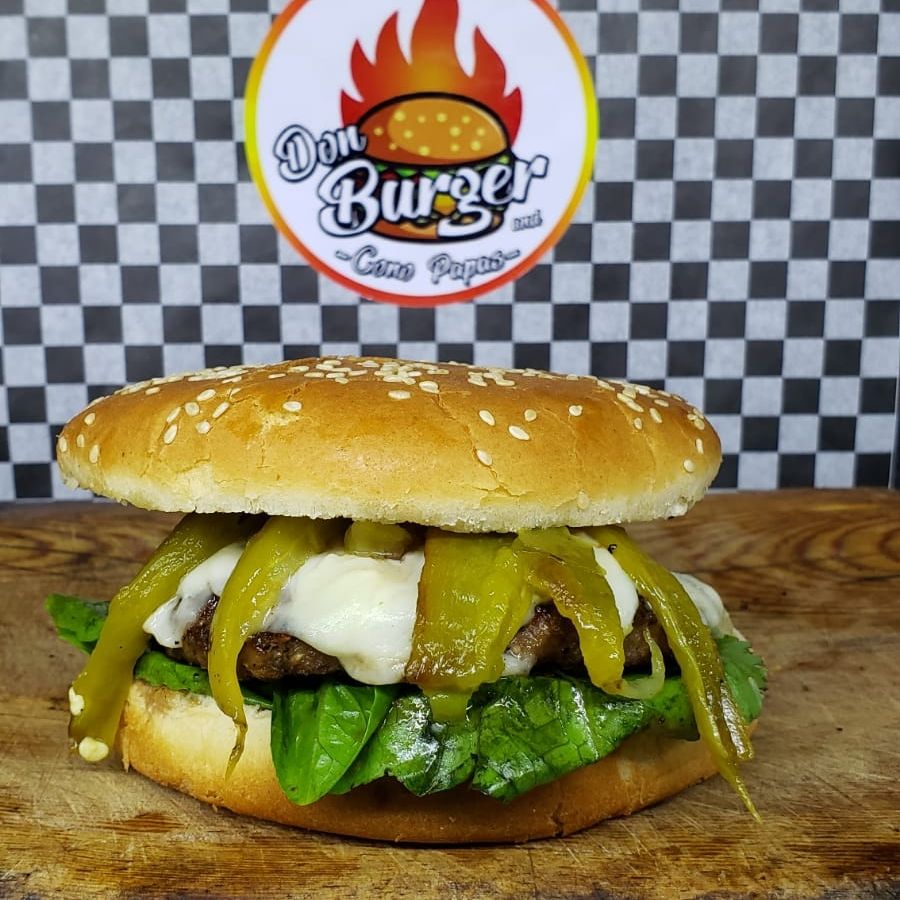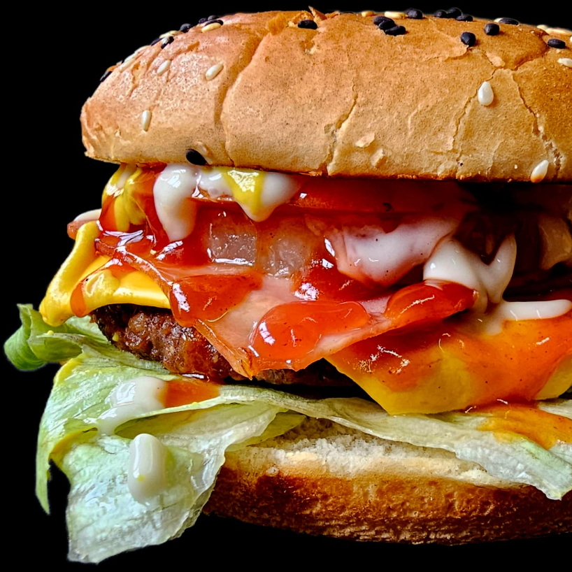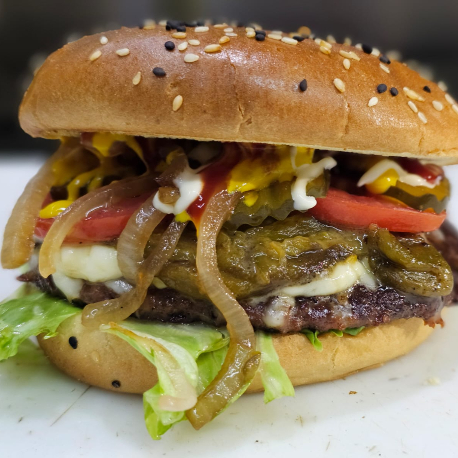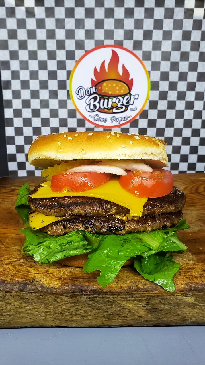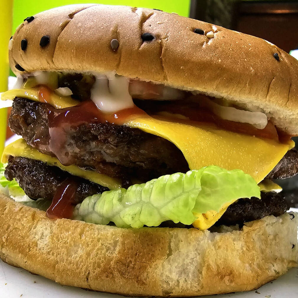 2 Carnes aprox. 150 gr. c/u, queso amarillo, vegetales y líquidos