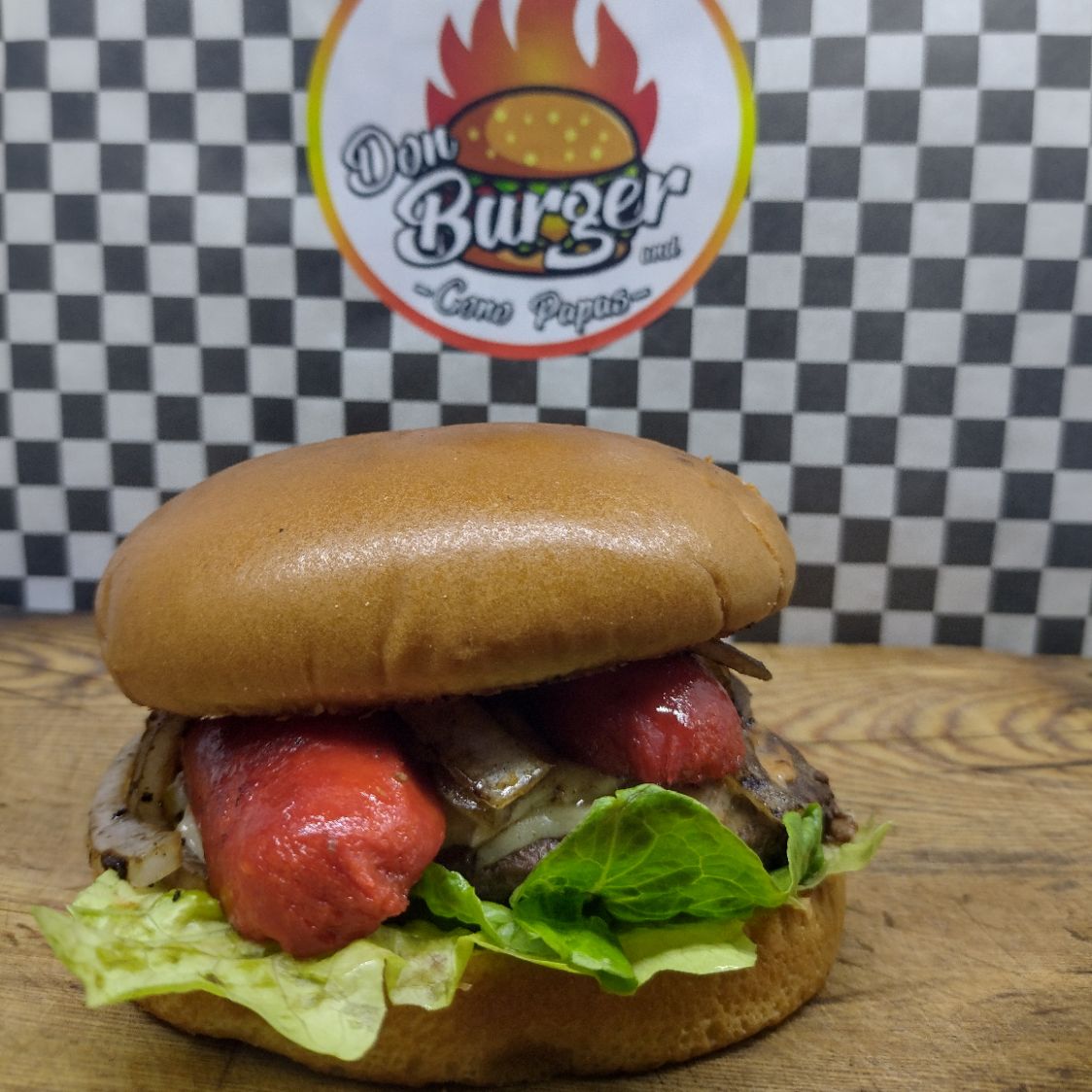 Carne, salchicha p/asar, queso fundido,cebolla caramelizada, vegetales y aderezos